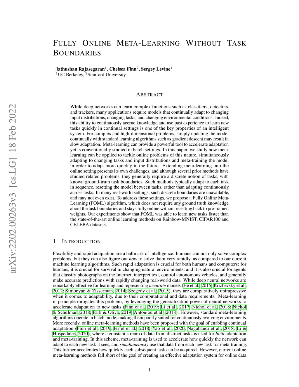 While deep networks can learn complex functions such as classifiers, detectors, and trackers, many applications require models that continually adapt to changing input distributions, changing tasks, and changing environmental conditions. Indeed, this ability to continuously accrue knowledge and use past experience to learn new tasks quickly in continual settings is one of the key properties of an intelligent system. For complex and high-dimensional problems, simply updating the model continually with standard learning algorithms such as gradient descent may result in slow adaptation. Meta-learning can provide a powerful tool to accelerate adaptation yet is conventionally studied in batch settings. In this paper, we study how meta-learning can be applied to tackle online problems of this nature, simultaneously adapting to changing tasks and input distributions and meta-training the model in order to adapt more quickly in the future. Extending meta-learning into the online setting presents its own challenges, and although several prior methods have studied related problems, they generally require a discrete notion of tasks, with known ground-truth task boundaries. Such methods typically adapt to each task in sequence, resetting the model between tasks, rather than adapting continuously across tasks. In many real-world settings, such discrete boundaries are unavailable, and may not even exist. To address these settings, we propose a Fully Online Meta-Learning (FOML) algorithm, which does not require any ground truth knowledge about the task boundaries and stays fully online without resetting back to pre-trained weights. Our experiments show that FOML was able to learn new tasks faster than the state-of-the-art online learning methods on Rainbow-MNIST, CIFAR100 and CELEBA datasets.