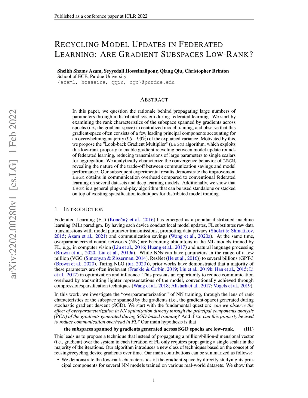 In this paper, we question the rationale behind propagating large numbers of parameters through a distributed system during federated learning. We start by examining the rank characteristics of the subspace spanned by gradients across epochs (i.e., the gradient-space) in centralized model training, and observe that this gradient-space often consists of a few leading principal components accounting for an overwhelming majority (95-99%) of the explained variance. Motivated by this, we propose the "Look-back Gradient Multiplier" (LBGM) algorithm, which exploits this low-rank property to enable gradient recycling between model update rounds of federated learning, reducing transmissions of large parameters to single scalars for aggregation. We analytically characterize the convergence behavior of LBGM, revealing the nature of the trade-off between communication savings and model performance. Our subsequent experimental results demonstrate the improvement LBGM obtains in communication overhead compared to conventional federated learning on several datasets and deep learning models. Additionally, we show that LBGM is a general plug-and-play algorithm that can be used standalone or stacked on top of existing sparsification techniques for distributed model training.