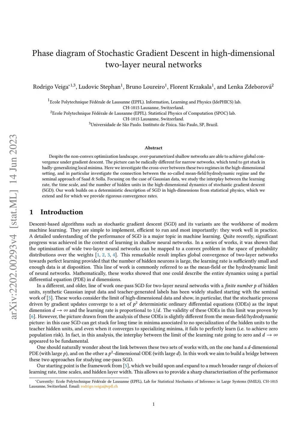 Despite the non-convex optimization landscape, over-parametrized shallow networks are able to achieve global convergence under gradient descent. The picture can be radically different for narrow networks, which tend to get stuck in badly-generalizing local minima. Here we investigate the cross-over between these two regimes in the high-dimensional setting, and in particular investigate the connection between the so-called mean-field/hydrodynamic regime and the seminal approach of Saad & Solla. Focusing on the case of Gaussian data, we study the interplay between the learning rate, the time scale, and the number of hidden units in the high-dimensional dynamics of stochastic gradient descent (SGD). Our work builds on a deterministic description of SGD in high-dimensions from statistical physics, which we extend and for which we provide rigorous convergence rates.