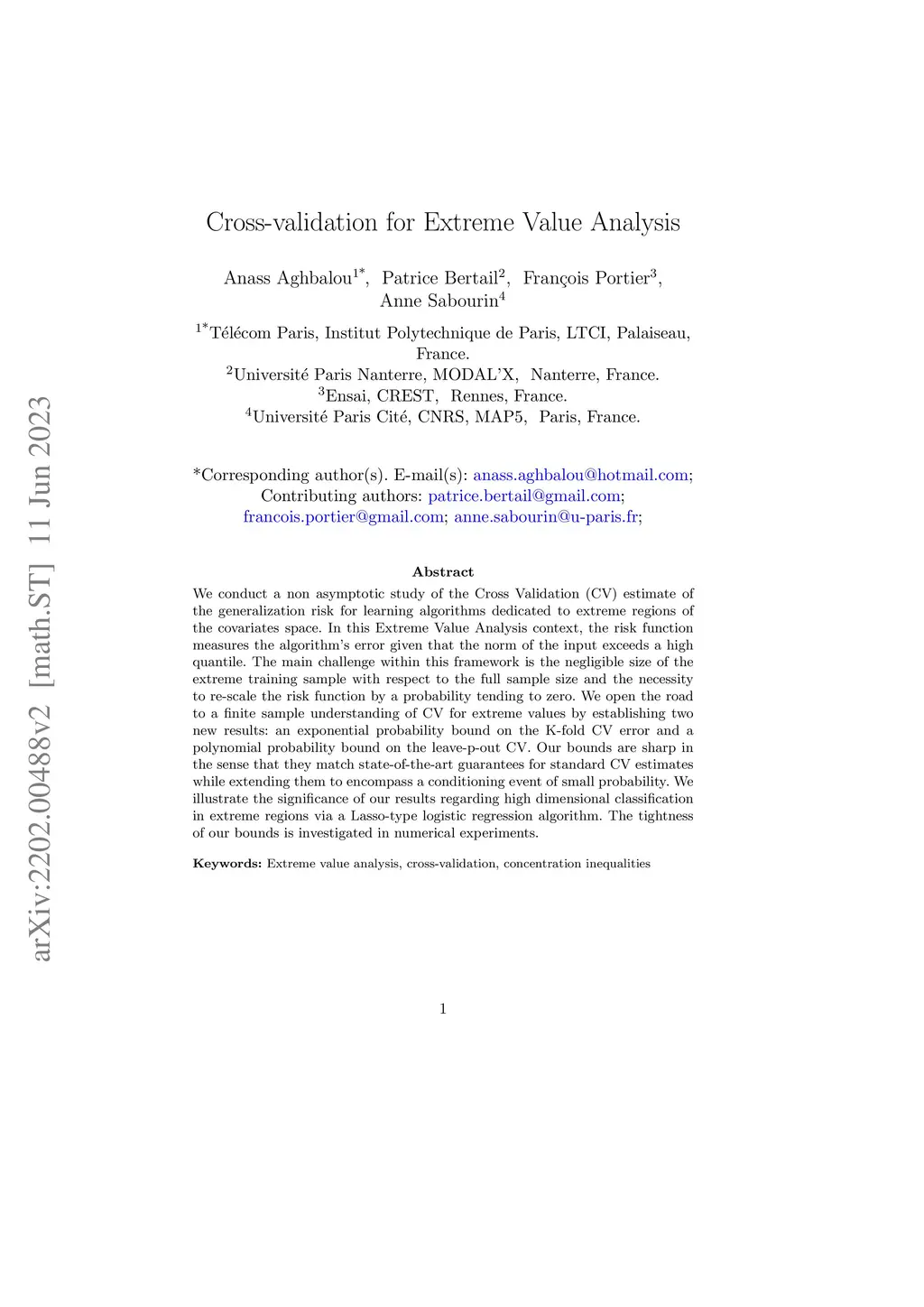 We conduct a non asymptotic study of the Cross Validation (CV) estimate of the generalization risk for learning algorithms dedicated to extreme regions of the covariates space. In this Extreme Value Analysis context, the risk function measures the algorithm's error given that the norm of the input exceeds a high quantile. The main challenge within this framework is the negligible size of the extreme training sample with respect to the full sample size and the necessity to re-scale the risk function by a probability tending to zero. We open the road to a finite sample understanding of CV for extreme values by establishing two new results: an exponential probability bound on the \Kfold CV error and a polynomial probability bound on the leave-\textrm{p}-out CV. Our bounds are sharp in the sense that they match state-of-the-art guarantees for standard CV estimates while extending them to encompass a conditioning event of small probability. We illustrate the significance of our results regarding high dimensional classification in extreme regions via a Lasso-type logistic regression algorithm. The tightness of our bounds is investigated in numerical experiments.