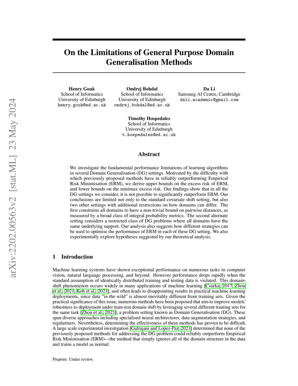 We investigate the fundamental performance limitations of learning algorithms in several Domain Generalisation (DG) settings. Motivated by the difficulty with which previously proposed methods have in reliably outperforming Empirical Risk Minimisation (ERM), we derive upper bounds on the excess risk of ERM, and lower bounds on the minimax excess risk. Our findings show that in all the DG settings we consider, it is not possible to significantly outperform ERM. Our conclusions are limited not only to the standard covariate shift setting, but also two other settings with additional restrictions on how domains can differ. The first constrains all domains to have a non-trivial bound on pairwise distances, as measured by a broad class of integral probability metrics. The second alternate setting considers a restricted class of DG problems where all domains have the same underlying support. Our analysis also suggests how different strategies can be used to optimise the performance of ERM in each of these DG setting. We also experimentally explore hypotheses suggested by our theoretical analysis.