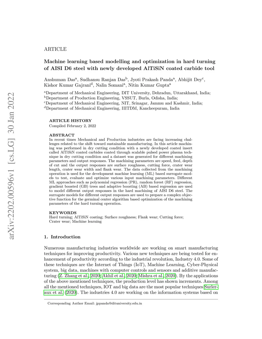 In recent times Mechanical and Production industries are facing increasing challenges related to the shift toward sustainable manufacturing. In this article, machining was performed in dry cutting condition with a newly developed coated insert called AlTiSiN coated carbides coated through scalable pulsed power plasma technique in dry cutting condition and a dataset was generated for different machining parameters and output responses. The machining parameters are speed, feed, depth of cut and the output responses are surface roughness, cutting force, crater wear length, crater wear width, and flank wear. The data collected from the machining operation is used for the development of machine learning (ML) based surrogate models to test, evaluate and optimize various input machining parameters. Different ML approaches such as polynomial regression (PR), random forest (RF) regression, gradient boosted (GB) trees, and adaptive boosting (AB) based regression are used to model different output responses in the hard machining of AISI D6 steel. The surrogate models for different output responses are used to prepare a complex objective function for the germinal center algorithm-based optimization of the machining parameters of the hard turning operation.