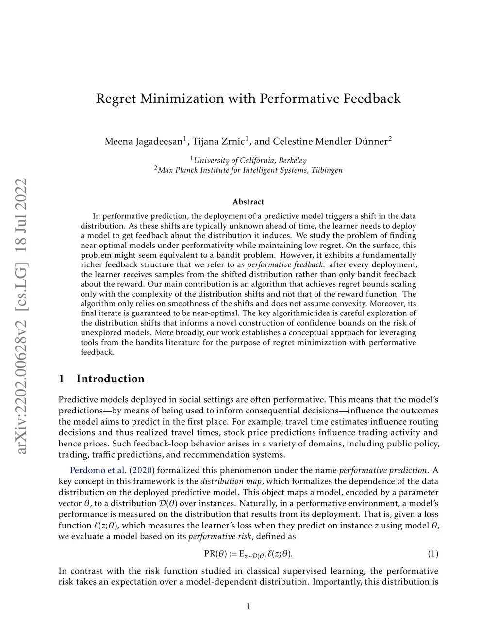 In performative prediction, the deployment of a predictive model triggers a shift in the data distribution. As these shifts are typically unknown ahead of time, the learner needs to deploy a model to get feedback about the distribution it induces. We study the problem of finding near-optimal models under performativity while maintaining low regret. On the surface, this problem might seem equivalent to a bandit problem. However, it exhibits a fundamentally richer feedback structure that we refer to as performative feedback: after every deployment, the learner receives samples from the shifted distribution rather than only bandit feedback about the reward. Our main contribution is an algorithm that achieves regret bounds scaling only with the complexity of the distribution shifts and not that of the reward function. The algorithm only relies on smoothness of the shifts and does not assume convexity. Moreover, its final iterate is guaranteed to be near-optimal. The key algorithmic idea is careful exploration of the distribution shifts that informs a novel construction of confidence bounds on the risk of unexplored models. More broadly, our work establishes a conceptual approach for leveraging tools from the bandits literature for the purpose of regret minimization with performative feedback.
