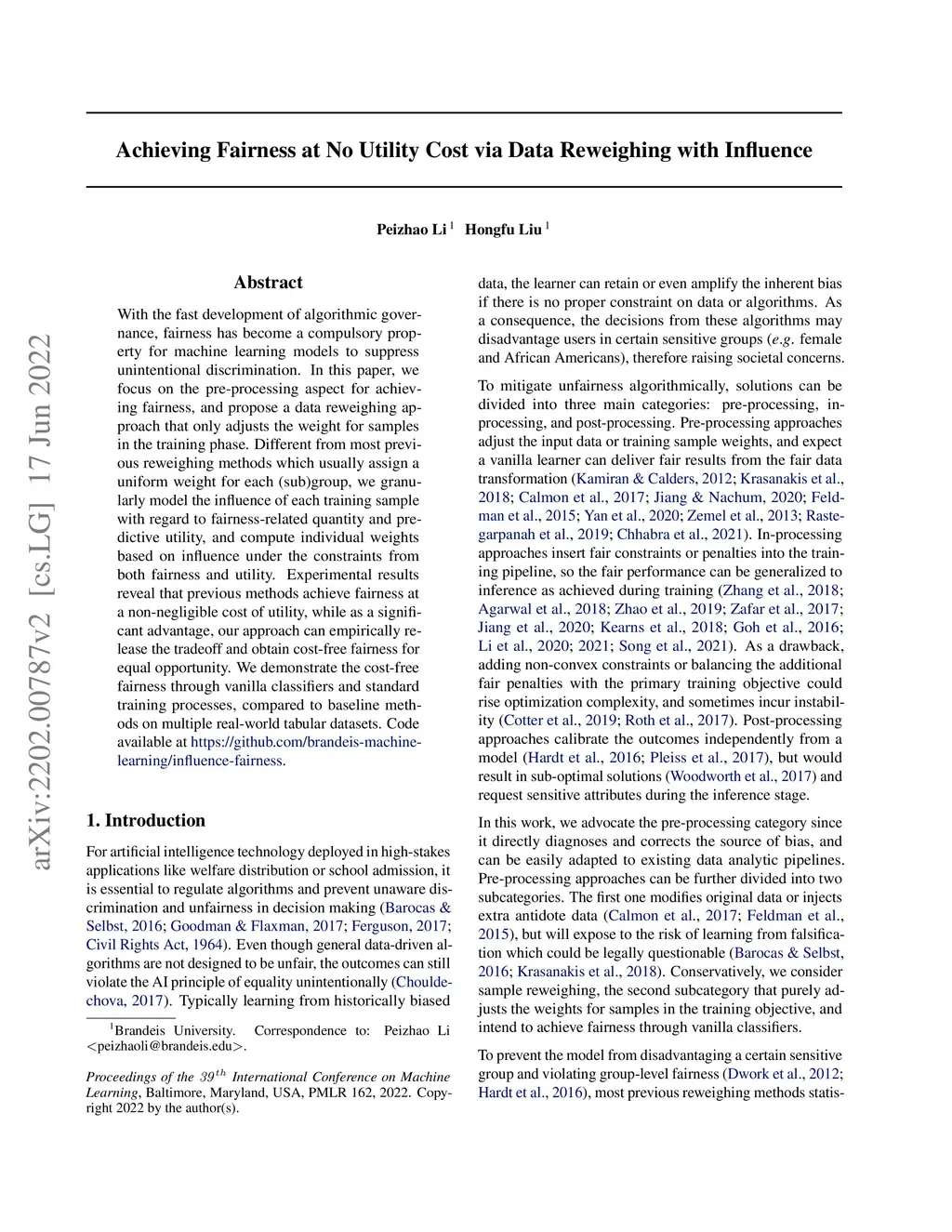 Achieving Fairness at No Utility Cost via Data Reweighing with Influence
