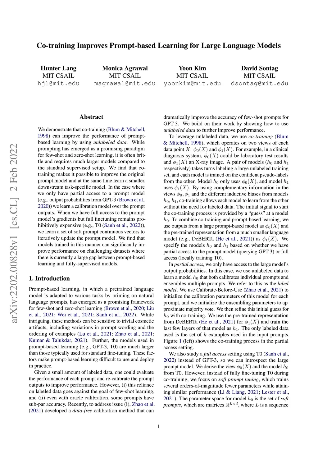 We demonstrate that co-training (Blum & Mitchell, 1998) can improve the performance of prompt-based learning by using unlabeled data. While prompting has emerged as a promising paradigm for few-shot and zero-shot learning, it is often brittle and requires much larger models compared to the standard supervised setup. We find that co-training makes it possible to improve the original prompt model and at the same time learn a smaller, downstream task-specific model. In the case where we only have partial access to a prompt model (e.g., output probabilities from GPT-3 (Brown et al., 2020)) we learn a calibration model over the prompt outputs. When we have full access to the prompt model's gradients but full finetuning remains prohibitively expensive (e.g., T0 (Sanh et al., 2021)), we learn a set of soft prompt continuous vectors to iteratively update the prompt model. We find that models trained in this manner can significantly improve performance on challenging datasets where there is currently a large gap between prompt-based learning and fully-supervised models.