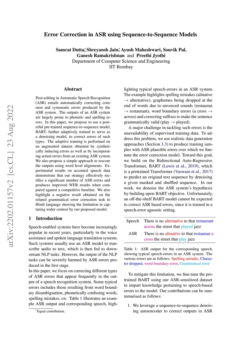 Post-editing in Automatic Speech Recognition (ASR) entails automatically correcting common and systematic errors produced by the ASR system. The outputs of an ASR system are largely prone to phonetic and spelling errors. In this paper, we propose to use a powerful pre-trained sequence-to-sequence model, BART, further adaptively trained to serve as a denoising model, to correct errors of such types. The adaptive training is performed on an augmented dataset obtained by synthetically inducing errors as well as by incorporating actual errors from an existing ASR system. We also propose a simple approach to rescore the outputs using word level alignments. Experimental results on accented speech data demonstrate that our strategy effectively rectifies a significant number of ASR errors and produces improved WER results when compared against a competitive baseline. We also highlight a negative result obtained on the related grammatical error correction task in Hindi language showing the limitation in capturing wider context by our proposed model.