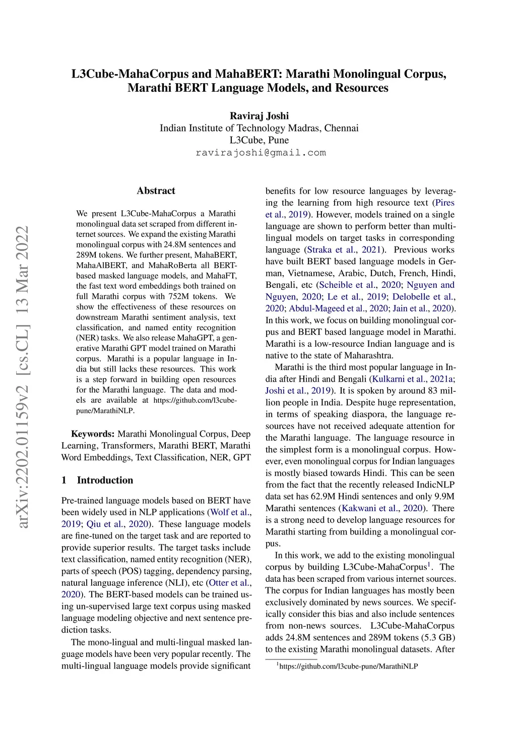We present L3Cube-MahaCorpus a Marathi monolingual data set scraped from different internet sources. We expand the existing Marathi monolingual corpus with 24.8M sentences and 289M tokens. We further present, MahaBERT, MahaAlBERT, and MahaRoBerta all BERT-based masked language models, and MahaFT, the fast text word embeddings both trained on full Marathi corpus with 752M tokens. We show the effectiveness of these resources on downstream Marathi sentiment analysis, text classification, and named entity recognition (NER) tasks. We also release MahaGPT, a generative Marathi GPT model trained on Marathi corpus. Marathi is a popular language in India but still lacks these resources. This work is a step forward in building open resources for the Marathi language. The data and models are available at https://github.com/l3cube-pune/MarathiNLP .