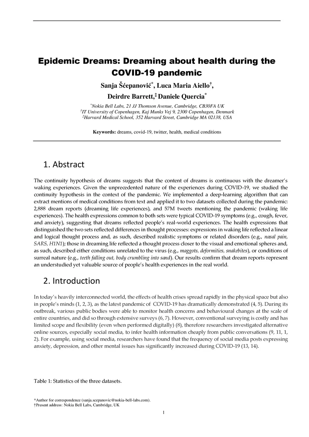 Epidemic Dreams: Dreaming about health during the COVID-19 pandemic