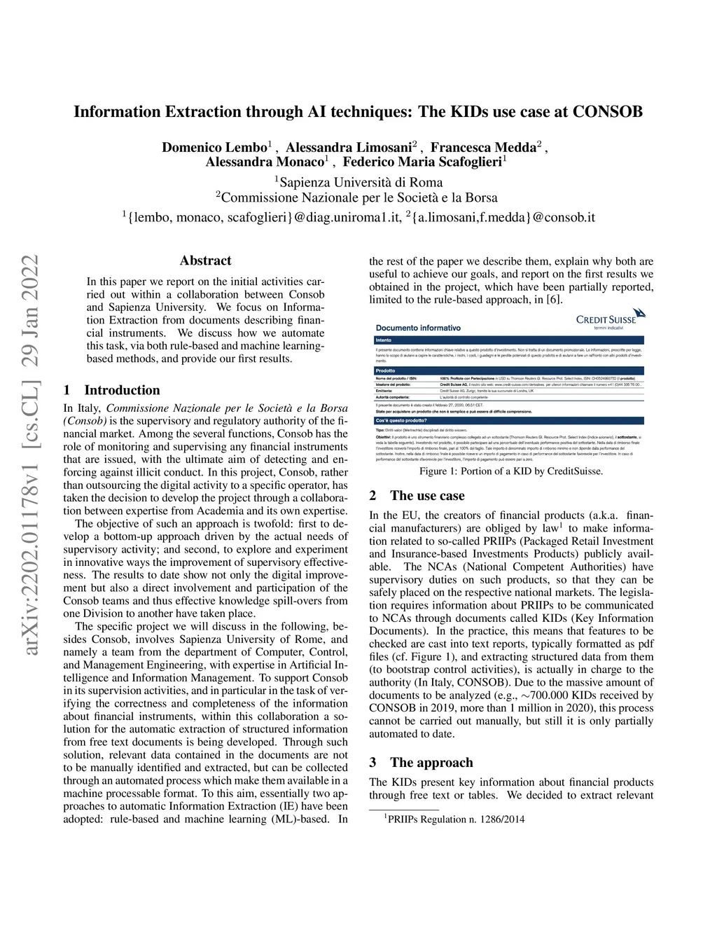 In this paper we report on the initial activities carried out within a collaboration between Consob and Sapienza University. We focus on Information Extraction from documents describing financial instruments. We discuss how we automate this task, via both rule-based and machine learning-based methods and provide our first results.