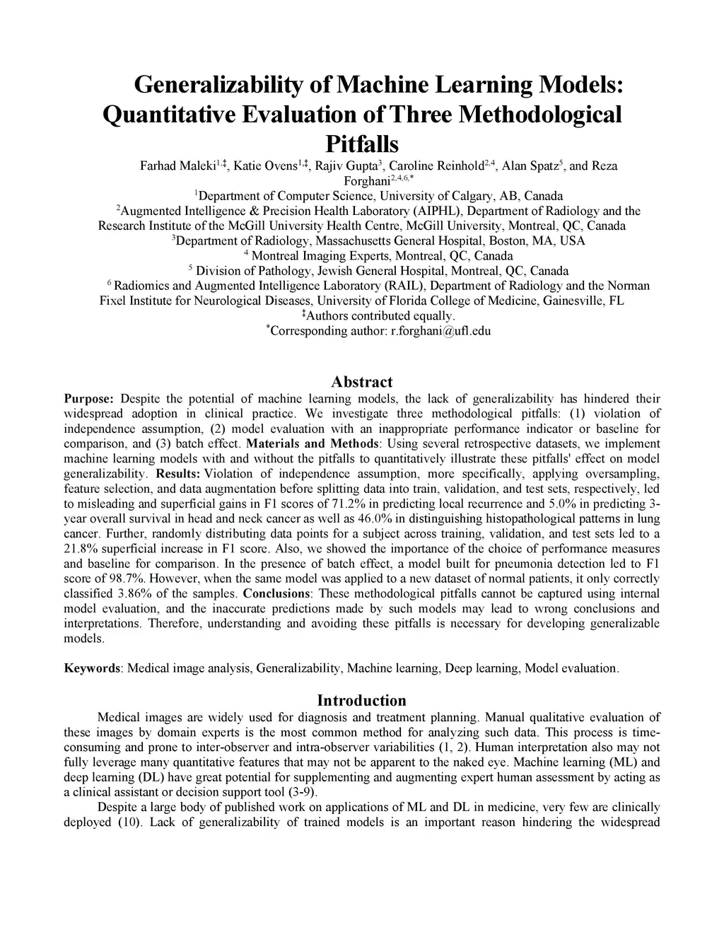 Purpose: Despite the potential of machine learning models, the lack of generalizability has hindered their widespread adoption in clinical practice. We investigate three methodological pitfalls: (1) violation of independence assumption, (2) model evaluation with an inappropriate performance indicator or baseline for comparison, and (3) batch effect. Materials and Methods: Using several retrospective datasets, we implement machine learning models with and without the pitfalls to quantitatively illustrate these pitfalls' effect on model generalizability. Results: Violation of independence assumption, more specifically, applying oversampling, feature selection, and data augmentation before splitting data into train, validation, and test sets, respectively, led to misleading and superficial gains in F1 scores of 71.2% in predicting local recurrence and 5.0% in predicting 3-year overall survival in head and neck cancer as well as 46.0% in distinguishing histopathological patterns in lung cancer. Further, randomly distributing data points for a subject across training, validation, and test sets led to a 21.8% superficial increase in F1 score. Also, we showed the importance of the choice of performance measures and baseline for comparison. In the presence of batch effect, a model built for pneumonia detection led to F1 score of 98.7%. However, when the same model was applied to a new dataset of normal patients, it only correctly classified 3.86% of the samples. Conclusions: These methodological pitfalls cannot be captured using internal model evaluation, and the inaccurate predictions made by such models may lead to wrong conclusions and interpretations. Therefore, understanding and avoiding these pitfalls is necessary for developing generalizable models.