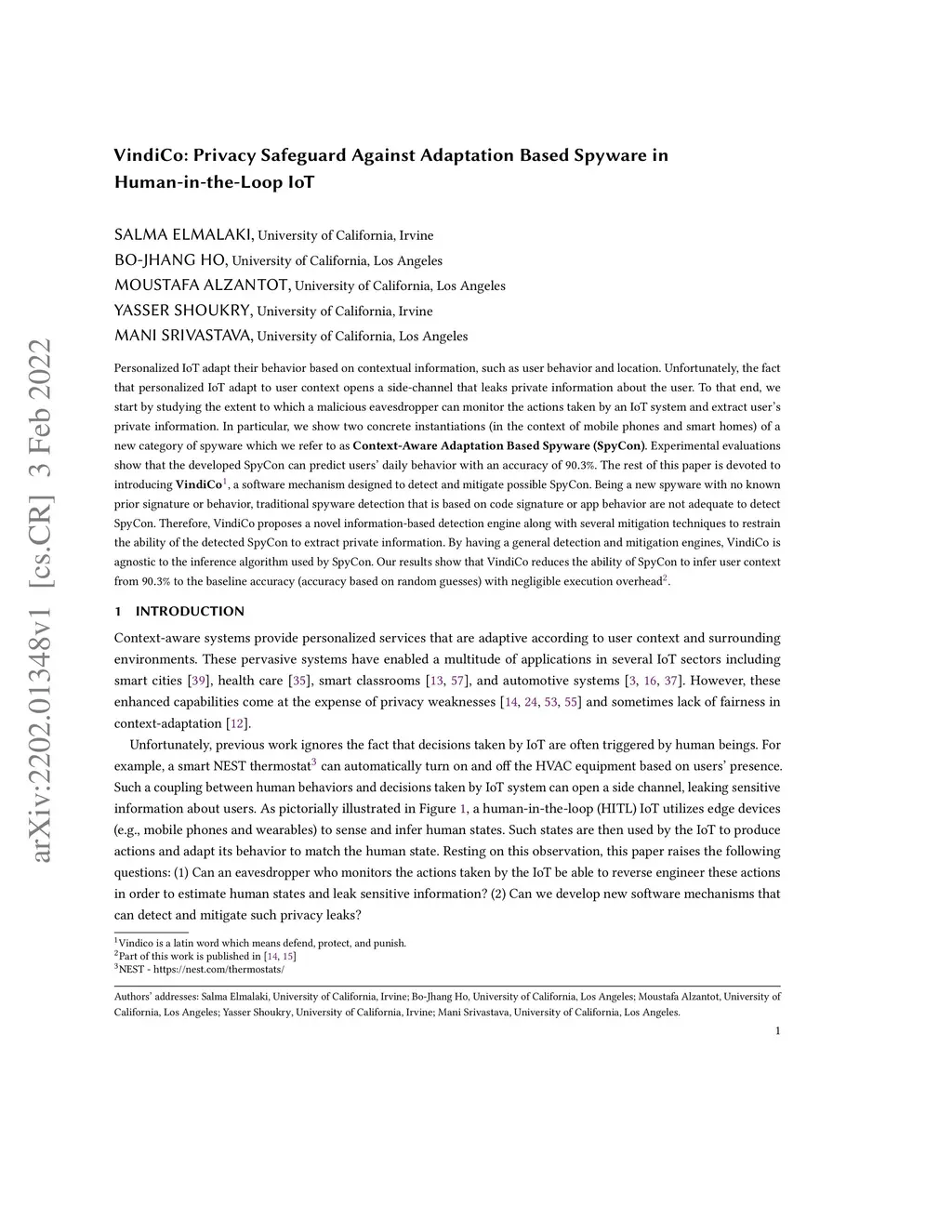 Personalized IoT adapts their behavior based on contextual information, such as user behavior and location. Unfortunately, the fact that personalized IoT adapts to user context opens a side-channel that leaks private information about the user. To that end, we start by studying the extent to which a malicious eavesdropper can monitor the actions taken by an IoT system and extract users' private information. In particular, we show two concrete instantiations (in the context of mobile phones and smart homes) of a new category of spyware which we refer to as Context-Aware Adaptation Based Spyware (SpyCon). Experimental evaluations show that the developed SpyCon can predict users' daily behavior with an accuracy of 90.3%. The rest of this paper is devoted to introducing VindiCo, a software mechanism designed to detect and mitigate possible SpyCon. Being new spyware with no known prior signature or behavior, traditional spyware detection that is based on code signature or app behavior is not adequate to detect SpyCon. Therefore, VindiCo proposes a novel information-based detection engine along with several mitigation techniques to restrain the ability of the detected SpyCon to extract private information. By having general detection and mitigation engines, VindiCo is agnostic to the inference algorithm used by SpyCon. Our results show that VindiCo reduces the ability of SpyCon to infer user context from 90.3% to the baseline accuracy (accuracy based on random guesses) with negligible execution overhead.
