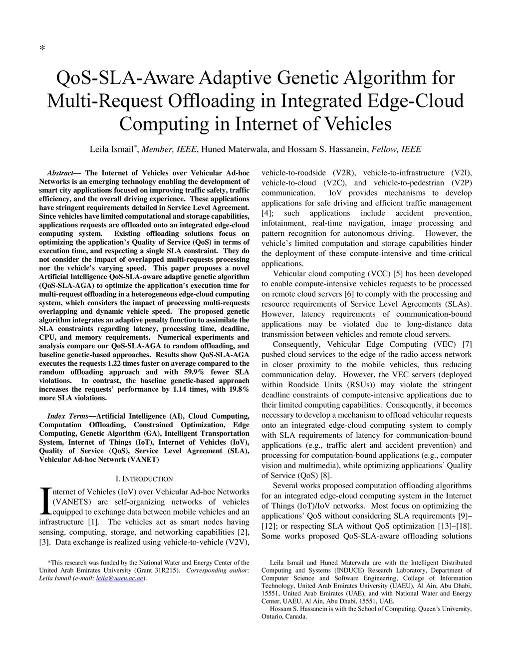 The Internet of Vehicles over Vehicular Ad-hoc Networks is an emerging technology enabling the development of smart city applications focused on improving traffic safety, traffic efficiency, and the overall driving experience. These applications have stringent requirements detailed in Service Level Agreement. Since vehicles have limited computational and storage capabilities, applications requests are offloaded onto an integrated edge-cloud computing system. Existing offloading solutions focus on optimizing the application's Quality of Service (QoS) in terms of execution time, and respecting a single SLA constraint. They do not consider the impact of overlapped multi-requests processing nor the vehicle's varying speed. This paper proposes a novel Artificial Intelligence QoS-SLA-aware adaptive genetic algorithm (QoS-SLA-AGA) to optimize the application's execution time for multi-request offloading in a heterogeneous edge-cloud computing system, which considers the impact of processing multi-requests overlapping and dynamic vehicle speed. The proposed genetic algorithm integrates an adaptive penalty function to assimilate the SLA constraints regarding latency, processing time, deadline, CPU, and memory requirements. Numerical experiments and analysis compare our QoS-SLA-AGA to random offloading, and baseline genetic-based approaches. Results show QoS-SLA-AGA executes the requests 1.22 times faster on average compared to the random offloading approach and with 59.9% fewer SLA violations. In contrast, the baseline genetic-based approach increases the requests' performance by 1.14 times, with 19.8% more SLA violations.