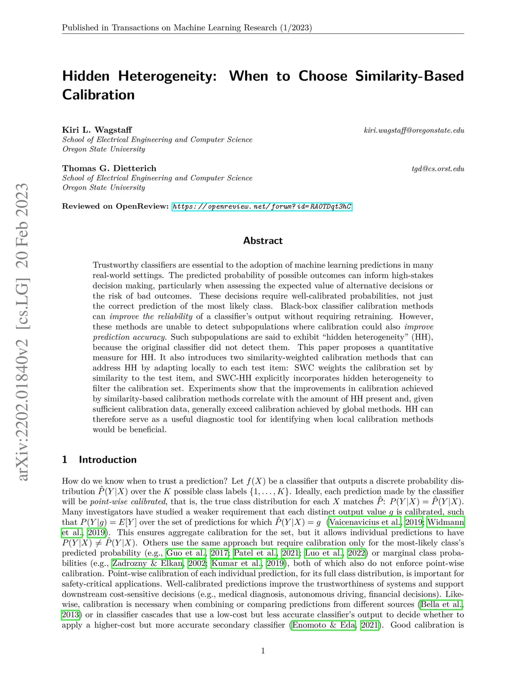 Trustworthy classifiers are essential to the adoption of machine learning predictions in many real-world settings. The predicted probability of possible outcomes can inform high-stakes decision making, particularly when assessing the expected value of alternative decisions or the risk of bad outcomes. These decisions require well-calibrated probabilities, not just the correct prediction of the most likely class. Black-box classifier calibration methods can improve the reliability of a classifier's output without requiring retraining. However, these methods are unable to detect subpopulations where calibration could also improve prediction accuracy. Such subpopulations are said to exhibit "hidden heterogeneity" (HH), because the original classifier did not detect them. This paper proposes a quantitative measure for HH. It also introduces two similarity-weighted calibration methods that can address HH by adapting locally to each test item: SWC weights the calibration set by similarity to the test item, and SWC-HH explicitly incorporates hidden heterogeneity to filter the calibration set. Experiments show that the improvements in calibration achieved by similarity-based calibration methods correlate with the amount of HH present and, given sufficient calibration data, generally exceed calibration achieved by global methods. HH can therefore serve as a useful diagnostic tool for identifying when local calibration methods would be beneficial.