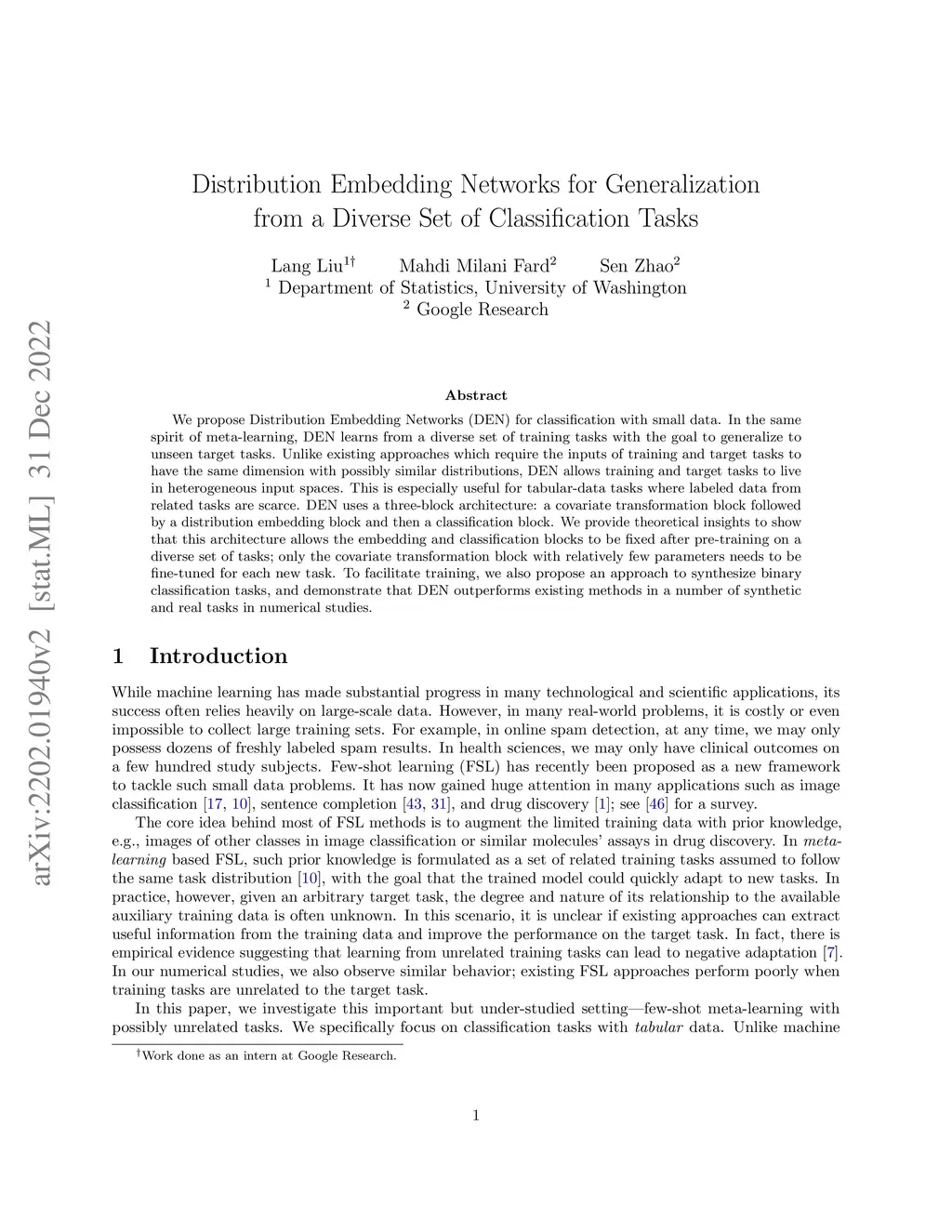 We propose Distribution Embedding Networks (DEN) for classification with small data. In the same spirit of meta-learning, DEN learns from a diverse set of training tasks with the goal to generalize to unseen target tasks. Unlike existing approaches which require the inputs of training and target tasks to have the same dimension with possibly similar distributions, DEN allows training and target tasks to live in heterogeneous input spaces. This is especially useful for tabular-data tasks where labeled data from related tasks are scarce. DEN uses a three-block architecture: a covariate transformation block followed by a distribution embedding block and then a classification block. We provide theoretical insights to show that this architecture allows the embedding and classification blocks to be fixed after pre-training on a diverse set of tasks; only the covariate transformation block with relatively few parameters needs to be fine-tuned for each new task. To facilitate training, we also propose an approach to synthesize binary classification tasks, and demonstrate that DEN outperforms existing methods in a number of synthetic and real tasks in numerical studies.