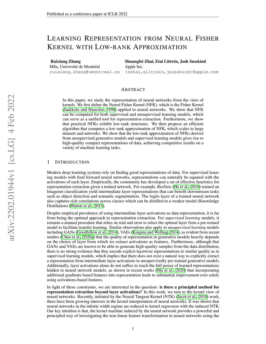 Learning Representation from Neural Fisher Kernel with Low-rank