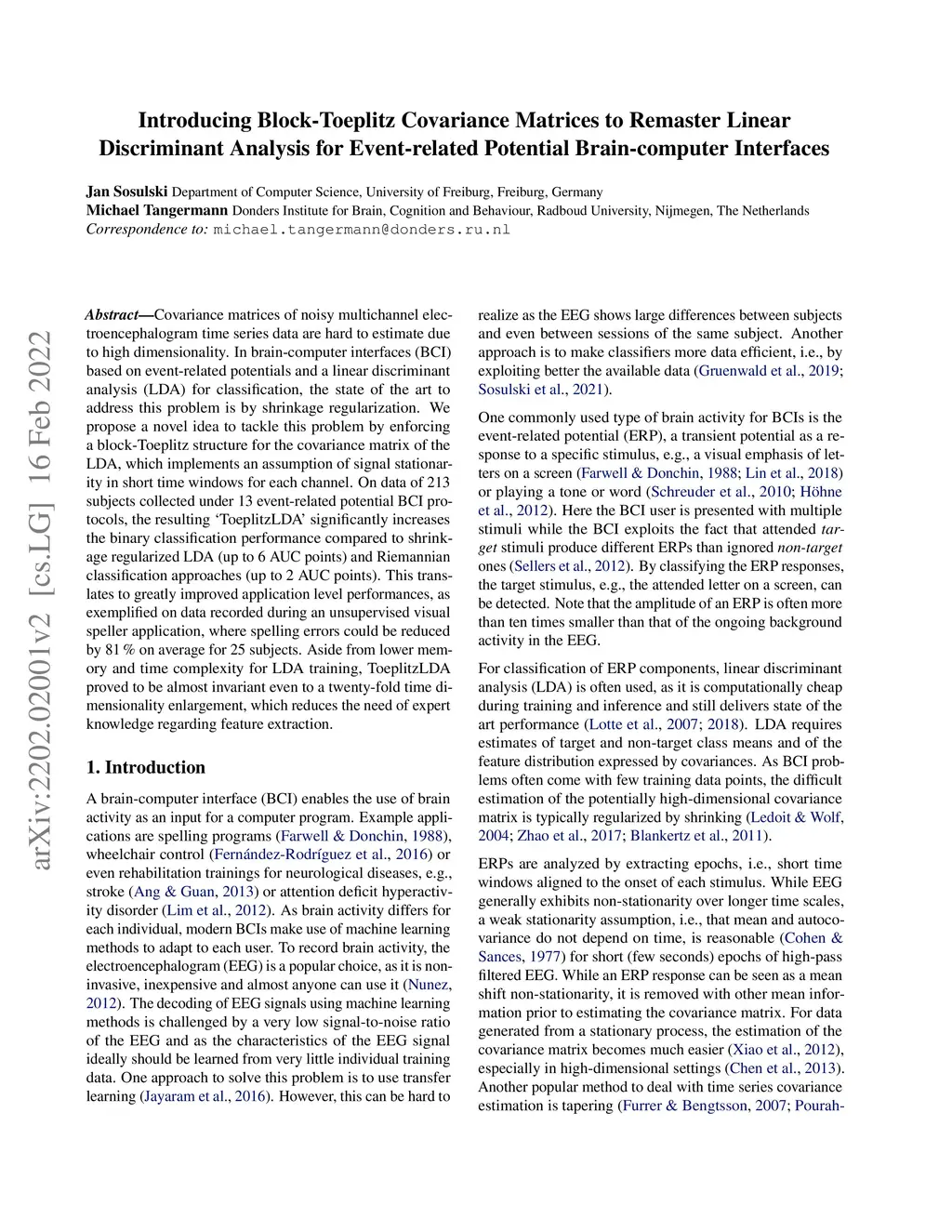 Covariance matrices of noisy multichannel electroencephalogram time series data are hard to estimate due to high dimensionality. In brain-computer interfaces (BCI) based on event-related potentials and a linear discriminant analysis (LDA) for classification, the state of the art to address this problem is by shrinkage regularization. We propose a novel idea to tackle this problem by enforcing a block-Toeplitz structure for the covariance matrix of the LDA, which implements an assumption of signal stationarity in short time windows for each channel. On data of 213 subjects collected under 13 event-related potential BCI protocols, the resulting 'ToeplitzLDA' significantly increases the binary classification performance compared to shrinkage regularized LDA (up to 6 AUC points) and Riemannian classification approaches (up to 2 AUC points). This translates to greatly improved application level performances, as exemplified on data recorded during an unsupervised visual speller application, where spelling errors could be reduced by 81% on average for 25 subjects. Aside from lower memory and time complexity for LDA training, ToeplitzLDA proved to be almost invariant even to a twenty-fold time dimensionality enlargement, which reduces the need of expert knowledge regarding feature extraction.