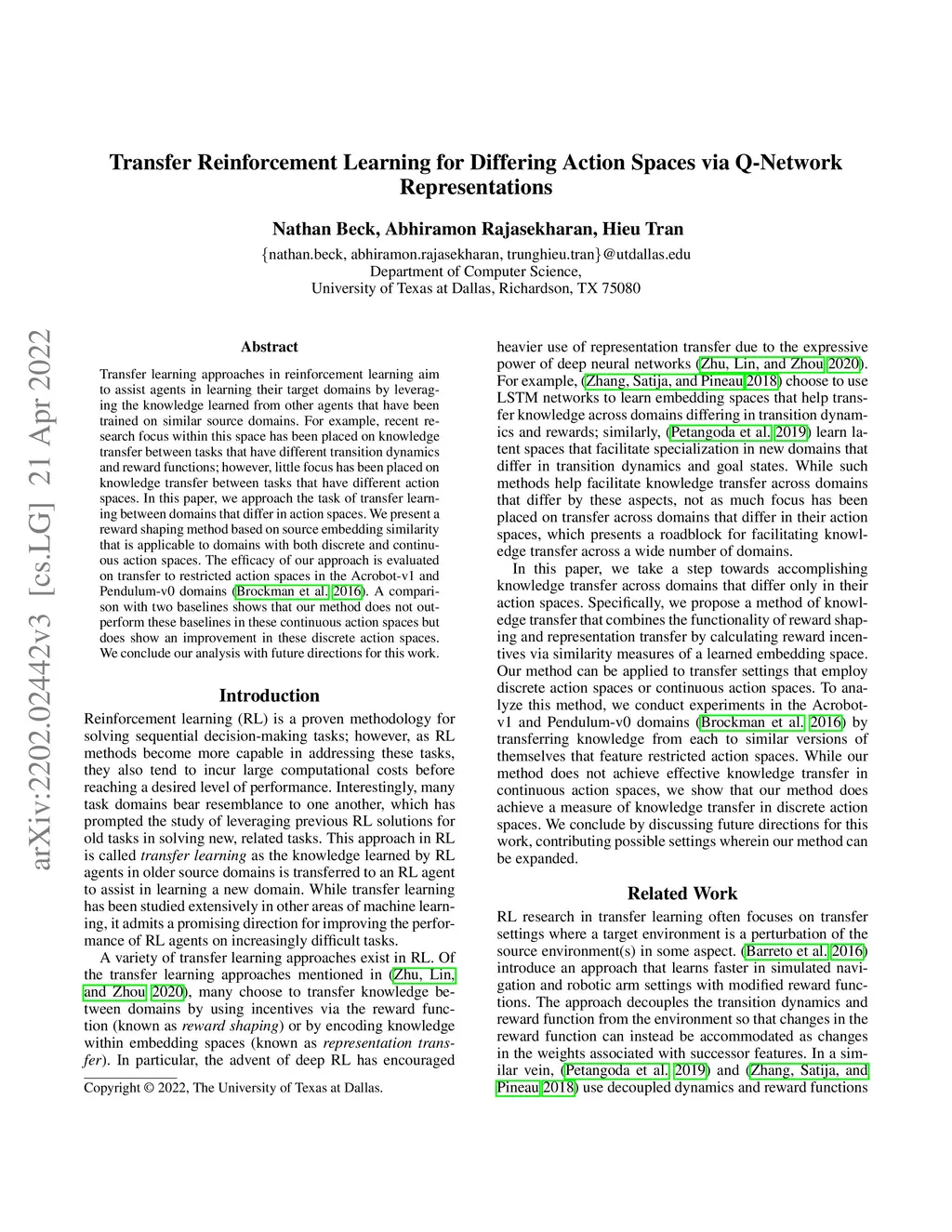 Transfer learning approaches in reinforcement learning aim to assist agents in learning their target domains by leveraging the knowledge learned from other agents that have been trained on similar source domains. For example, recent research focus within this space has been placed on knowledge transfer between tasks that have different transition dynamics and reward functions; however, little focus has been placed on knowledge transfer between tasks that have different action spaces. In this paper, we approach the task of transfer learning between domains that differ in action spaces. We present a reward shaping method based on source embedding similarity that is applicable to domains with both discrete and continuous action spaces. The efficacy of our approach is evaluated on transfer to restricted action spaces in the Acrobot-v1 and Pendulum-v0 domains. A comparison with two baselines shows that our method does not outperform these baselines in these continuous action spaces but does show an improvement in these discrete action spaces. We conclude our analysis with future directions for this work.