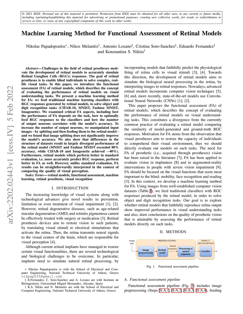 Challenges in the field of retinal prostheses motivate the development of retinal models to accurately simulate Retinal Ganglion Cells (RGCs) responses. The goal of retinal prostheses is to enable blind individuals to solve complex, reallife visual tasks. In this paper, we introduce the functional assessment (FA) of retinal models, which describes the concept of evaluating the performance of retinal models on visual understanding tasks. We present a machine learning method for FA: we feed traditional machine learning classifiers with RGC responses generated by retinal models, to solve object and digit recognition tasks (CIFAR-10, MNIST, Fashion MNIST, Imagenette). We examined critical FA aspects, including how the performance of FA depends on the task, how to optimally feed RGC responses to the classifiers and how the number of output neurons correlates with the model's accuracy. To increase the number of output neurons, we manipulated input images - by splitting and then feeding them to the retinal model and we found that image splitting does not significantly improve the model's accuracy. We also show that differences in the structure of datasets result in largely divergent performance of the retinal model (MNIST and Fashion MNIST exceeded 80% accuracy, while CIFAR-10 and Imagenette achieved ~40%). Furthermore, retinal models which perform better in standard evaluation, i.e. more accurately predict RGC response, perform better in FA as well. However, unlike standard evaluation, FA results can be straightforwardly interpreted in the context of comparing the quality of visual perception.
