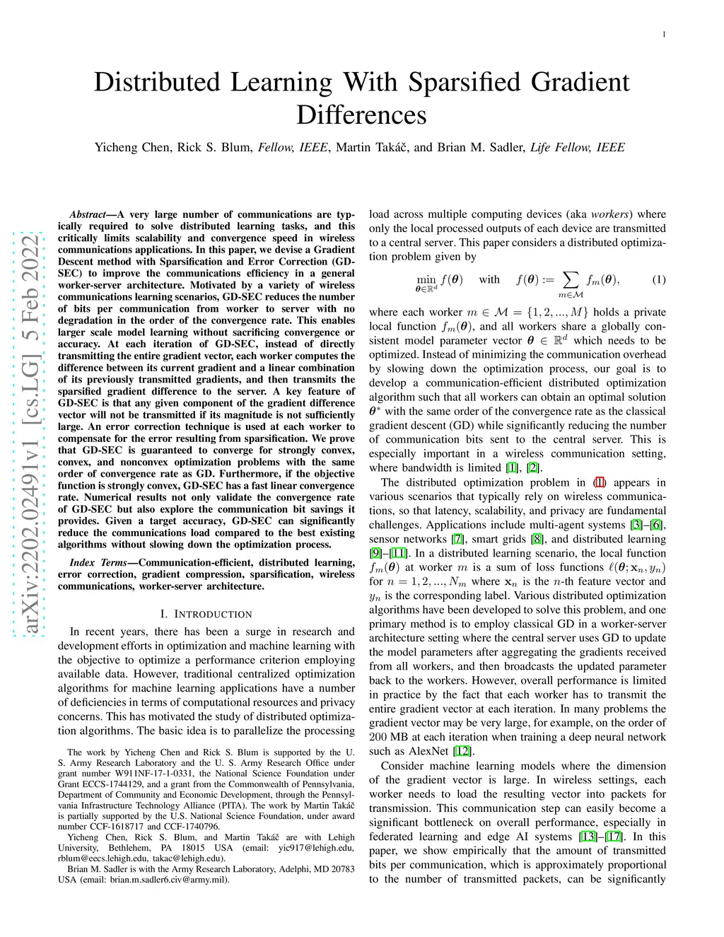 A very large number of communications are typically required to solve distributed learning tasks, and this critically limits scalability and convergence speed in wireless communications applications. In this paper, we devise a Gradient Descent method with Sparsification and Error Correction (GD-SEC) to improve the communications efficiency in a general worker-server architecture. Motivated by a variety of wireless communications learning scenarios, GD-SEC reduces the number of bits per communication from worker to server with no degradation in the order of the convergence rate. This enables larger-scale model learning without sacrificing convergence or accuracy. At each iteration of GD-SEC, instead of directly transmitting the entire gradient vector, each worker computes the difference between its current gradient and a linear combination of its previously transmitted gradients, and then transmits the sparsified gradient difference to the server. A key feature of GD-SEC is that any given component of the gradient difference vector will not be transmitted if its magnitude is not sufficiently large. An error correction technique is used at each worker to compensate for the error resulting from sparsification. We prove that GD-SEC is guaranteed to converge for strongly convex, convex, and nonconvex optimization problems with the same order of convergence rate as GD. Furthermore, if the objective function is strongly convex, GD-SEC has a fast linear convergence rate. Numerical results not only validate the convergence rate of GD-SEC but also explore the communication bit savings it provides. Given a target accuracy, GD-SEC can significantly reduce the communications load compared to the best existing algorithms without slowing down the optimization process.