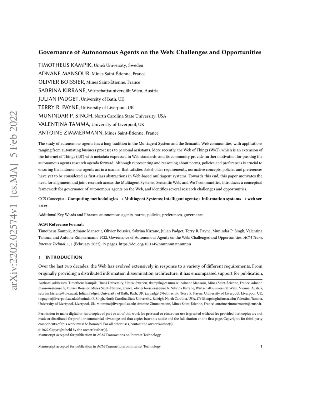 The study of autonomous agents has a long tradition in the Multiagent Systems and the Semantic Web communities, with applications ranging from automating business processes to personal assistants. More recently, the Web of Things (WoT), which is an extension of the Internet of Things (IoT) with metadata expressed in Web standards, and its community provide further motivation for pushing the autonomous agents research agenda forward. Although representing and reasoning about norms, policies and preferences is crucial to ensuring that autonomous agents act in a manner that satisfies stakeholder requirements, normative concepts, policies and preferences have yet to be considered as first-class abstractions in Web-based multiagent systems. Towards this end, this paper motivates the need for alignment and joint research across the Multiagent Systems, Semantic Web, and WoT communities, introduces a conceptual framework for governance of autonomous agents on the Web, and identifies several research challenges and opportunities.