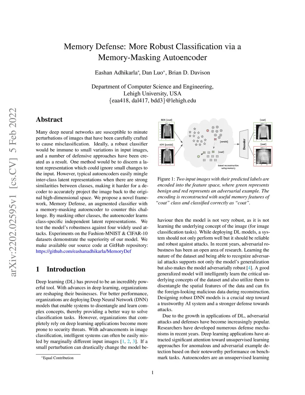 Many deep neural networks are susceptible to minute perturbations of images that have been carefully crafted to cause misclassification. Ideally, a robust classifier would be immune to small variations in input images, and a number of defensive approaches have been created as a result. One method would be to discern a latent representation which could ignore small changes to the input. However, typical autoencoders easily mingle inter-class latent representations when there are strong similarities between classes, making it harder for a decoder to accurately project the image back to the original high-dimensional space. We propose a novel framework, Memory Defense, an augmented classifier with a memory-masking autoencoder to counter this challenge. By masking other classes, the autoencoder learns class-specific independent latent representations. We test the model's robustness against four widely used attacks. Experiments on the Fashion-MNIST & CIFAR-10 datasets demonstrate the superiority of our model. We make available our source code at GitHub repository: https://github.com/eashanadhikarla/MemDefense