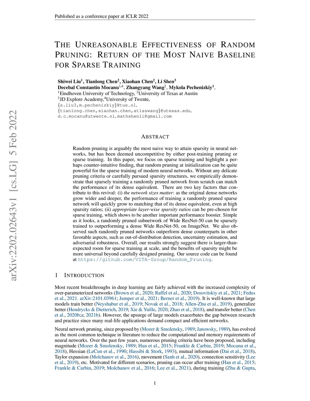 Random pruning is arguably the most naive way to attain sparsity in neural networks, but has been deemed uncompetitive by either post-training pruning or sparse training. In this paper, we focus on sparse training and highlight a perhaps counter-intuitive finding, that random pruning at initialization can be quite powerful for the sparse training of modern neural networks. Without any delicate pruning criteria or carefully pursued sparsity structures, we empirically demonstrate that sparsely training a randomly pruned network from scratch can match the performance of its dense equivalent. There are two key factors that contribute to this revival: (i) the network sizes matter: as the original dense networks grow wider and deeper, the performance of training a randomly pruned sparse network will quickly grow to matching that of its dense equivalent, even at high sparsity ratios; (ii) appropriate layer-wise sparsity ratios can be pre-chosen for sparse training, which shows to be another important performance booster. Simple as it looks, a randomly pruned subnetwork of Wide ResNet-50 can be sparsely trained to outperforming a dense Wide ResNet-50, on ImageNet. We also observed such randomly pruned networks outperform dense counterparts in other favorable aspects, such as out-of-distribution detection, uncertainty estimation, and adversarial robustness. Overall, our results strongly suggest there is larger-than-expected room for sparse training at scale, and the benefits of sparsity might be more universal beyond carefully designed pruning. Our source code can be found at https://github.com/VITA-Group/Random_Pruning.