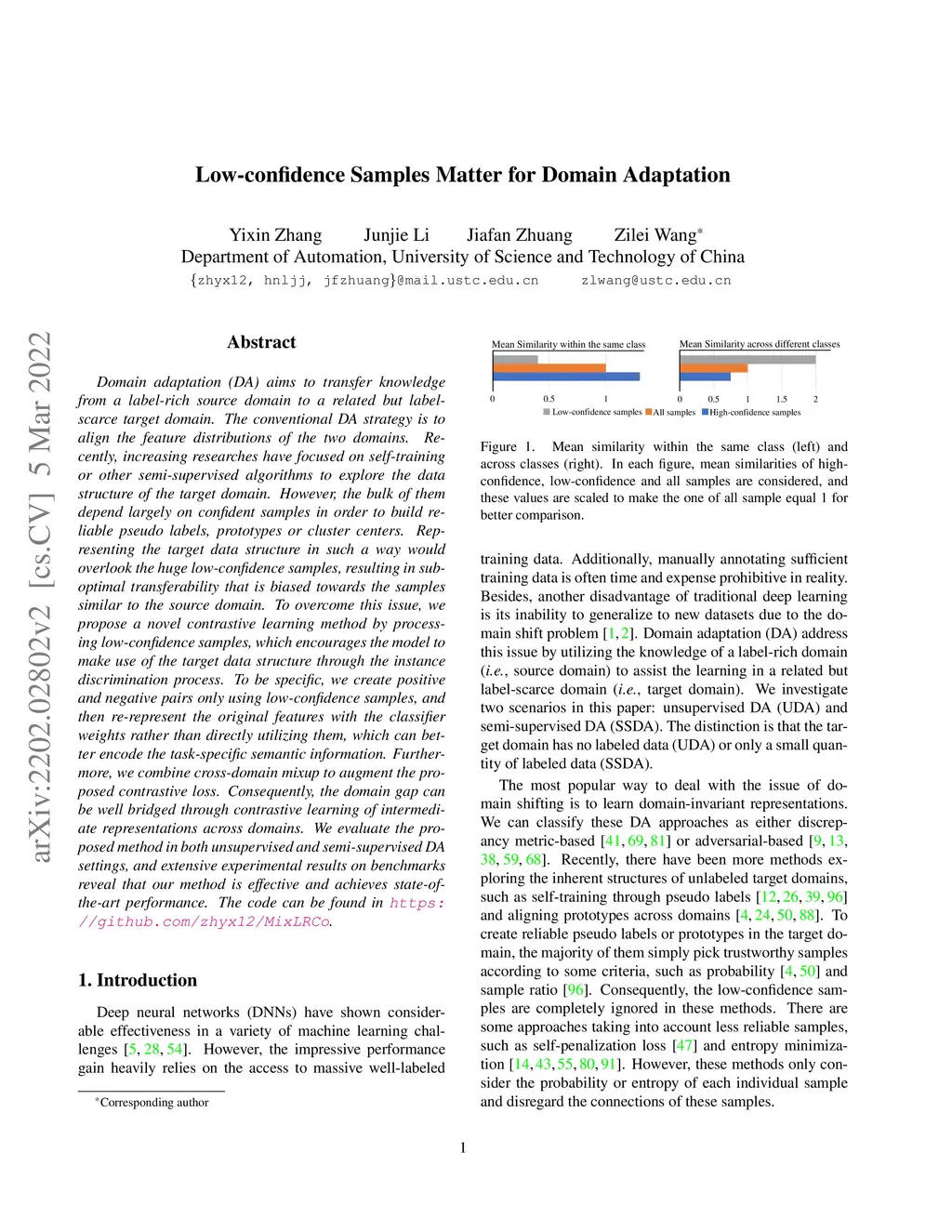 Domain adaptation (DA) aims to transfer knowledge from a label-rich source domain to a related but label-scarce target domain. The conventional DA strategy is to align the feature distributions of the two domains. Recently, increasing researches have focused on self-training or other semi-supervised algorithms to explore the data structure of the target domain. However, the bulk of them depend largely on confident samples in order to build reliable pseudo labels, prototypes or cluster centers. Representing the target data structure in such a way would overlook the huge low-confidence samples, resulting in sub-optimal transferability that is biased towards the samples similar to the source domain. To overcome this issue, we propose a novel contrastive learning method by processing low-confidence samples, which encourages the model to make use of the target data structure through the instance discrimination process. To be specific, we create positive and negative pairs only using low-confidence samples, and then re-represent the original features with the classifier weights rather than directly utilizing them, which can better encode the task-specific semantic information. Furthermore, we combine cross-domain mixup to augment the proposed contrastive loss. Consequently, the domain gap can be well bridged through contrastive learning of intermediate representations across domains. We evaluate the proposed method in both unsupervised and semi-supervised DA settings, and extensive experimental results on benchmarks reveal that our method is effective and achieves state-of-the-art performance. The code can be found in https://github.com/zhyx12/MixLRCo.