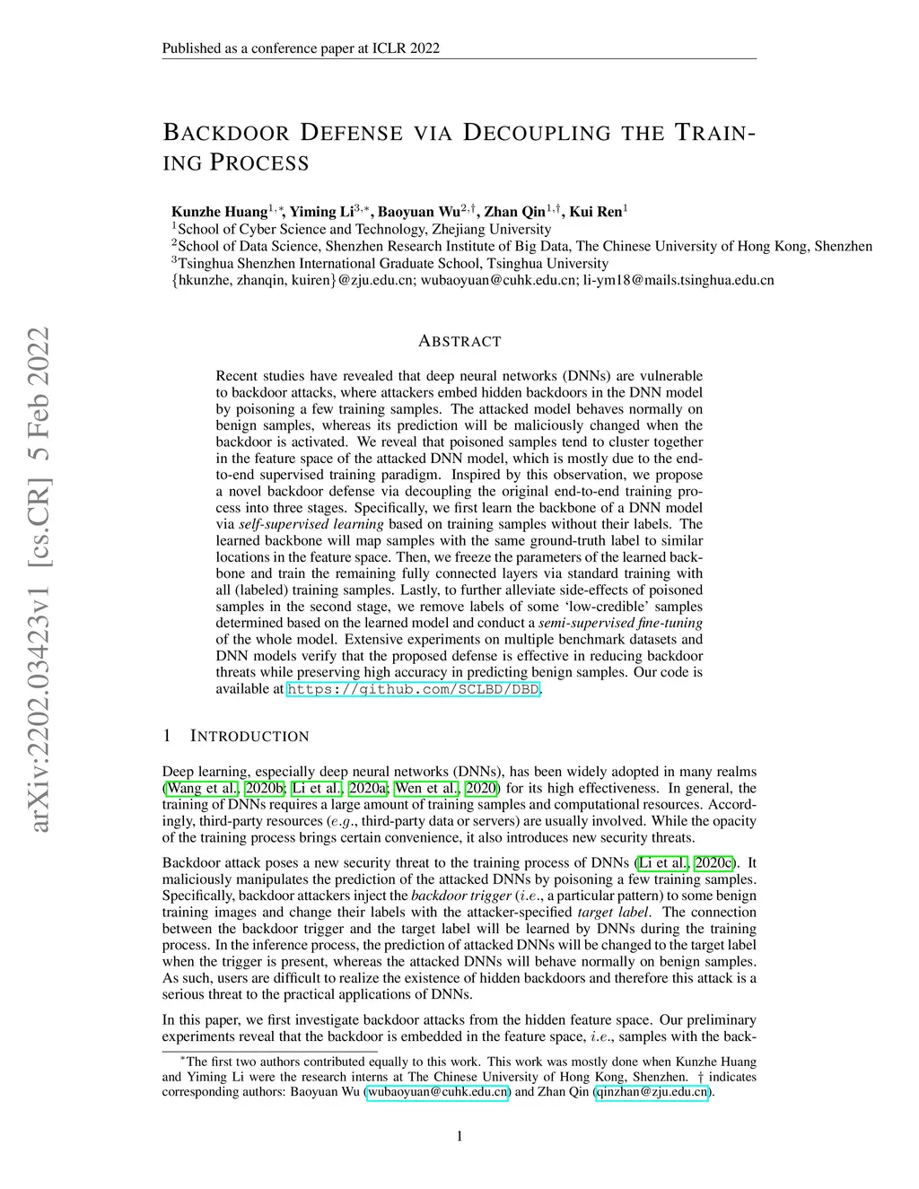 Recent studies have revealed that deep neural networks (DNNs) are vulnerable to backdoor attacks, where attackers embed hidden backdoors in the DNN model by poisoning a few training samples. The attacked model behaves normally on benign samples, whereas its prediction will be maliciously changed when the backdoor is activated. We reveal that poisoned samples tend to cluster together in the feature space of the attacked DNN model, which is mostly due to the end-to-end supervised training paradigm. Inspired by this observation, we propose a novel backdoor defense via decoupling the original end-to-end training process into three stages. Specifically, we first learn the backbone of a DNN model via \emph{self-supervised learning} based on training samples without their labels. The learned backbone will map samples with the same ground-truth label to similar locations in the feature space. Then, we freeze the parameters of the learned backbone and train the remaining fully connected layers via standard training with all (labeled) training samples. Lastly, to further alleviate side-effects of poisoned samples in the second stage, we remove labels of some `low-credible' samples determined based on the learned model and conduct a \emph{semi-supervised fine-tuning} of the whole model. Extensive experiments on multiple benchmark datasets and DNN models verify that the proposed defense is effective in reducing backdoor threats while preserving high accuracy in predicting benign samples. Our code is available at \url{https://github.com/SCLBD/DBD}.