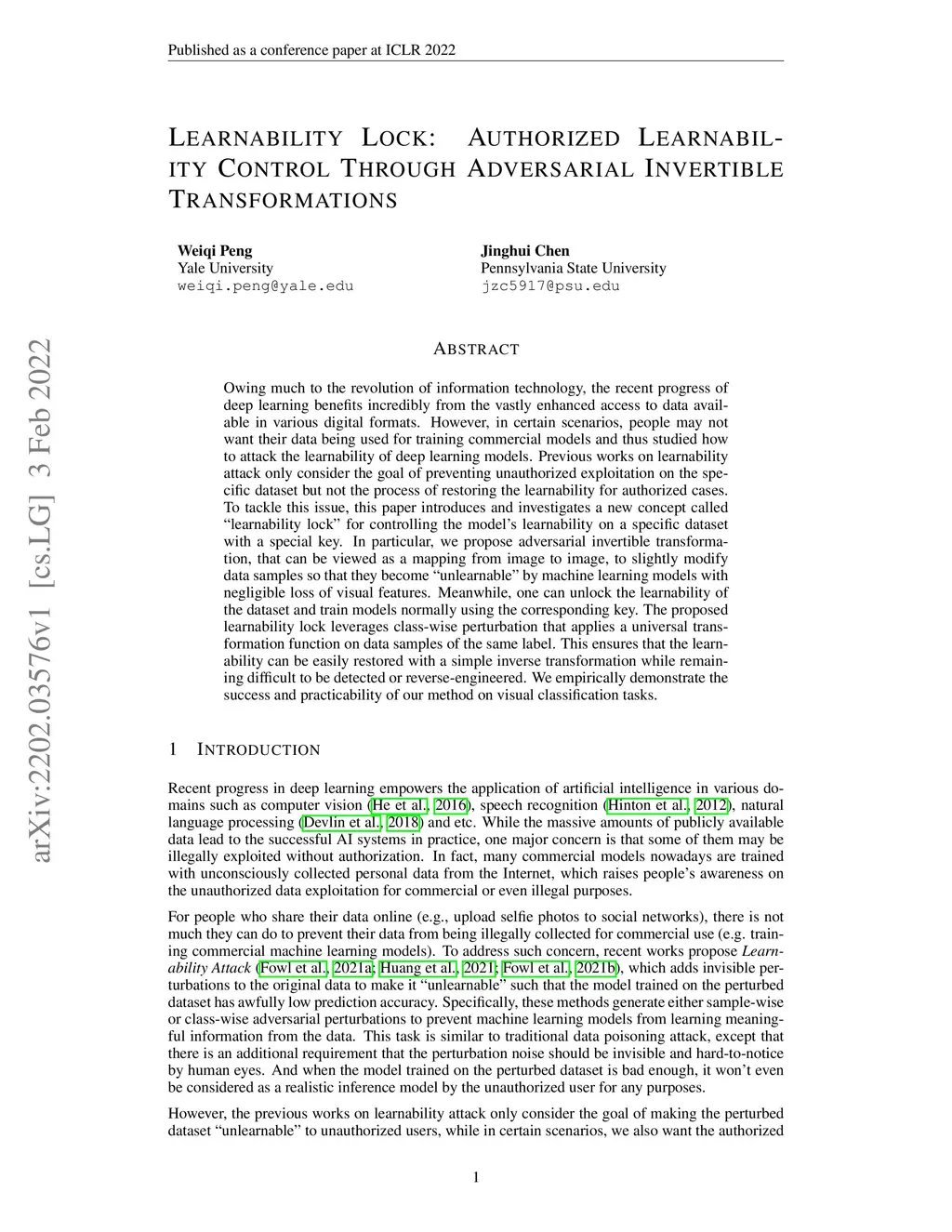 Owing much to the revolution of information technology, the recent progress of deep learning benefits incredibly from the vastly enhanced access to data available in various digital formats. However, in certain scenarios, people may not want their data being used for training commercial models and thus studied how to attack the learnability of deep learning models. Previous works on learnability attack only consider the goal of preventing unauthorized exploitation on the specific dataset but not the process of restoring the learnability for authorized cases. To tackle this issue, this paper introduces and investigates a new concept called "learnability lock" for controlling the model's learnability on a specific dataset with a special key. In particular, we propose adversarial invertible transformation, that can be viewed as a mapping from image to image, to slightly modify data samples so that they become "unlearnable" by machine learning models with negligible loss of visual features. Meanwhile, one can unlock the learnability of the dataset and train models normally using the corresponding key. The proposed learnability lock leverages class-wise perturbation that applies a universal transformation function on data samples of the same label. This ensures that the learnability can be easily restored with a simple inverse transformation while remaining difficult to be detected or reverse-engineered. We empirically demonstrate the success and practicability of our method on visual classification tasks.