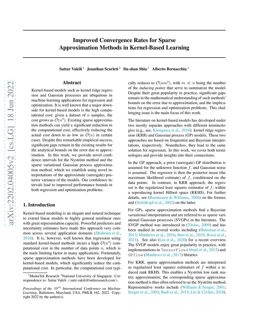Kernel-based models such as kernel ridge regression and Gaussian processes are ubiquitous in machine learning applications for regression and optimization. It is well known that a major downside for kernel-based models is the high computational cost; given a dataset of samples, the cost grows as . Existing sparse approximation methods can yield a significant reduction in the computational cost, effectively reducing the actual cost down to as low as in certain cases. Despite this remarkable empirical success, significant gaps remain in the existing results for the analytical bounds on the error due to approximation. In this work, we provide novel confidence intervals for the Nystr\"om method and the sparse variational Gaussian process approximation method, which we establish using novel interpretations of the approximate (surrogate) posterior variance of the models. Our confidence intervals lead to improved performance bounds in both regression and optimization problems.