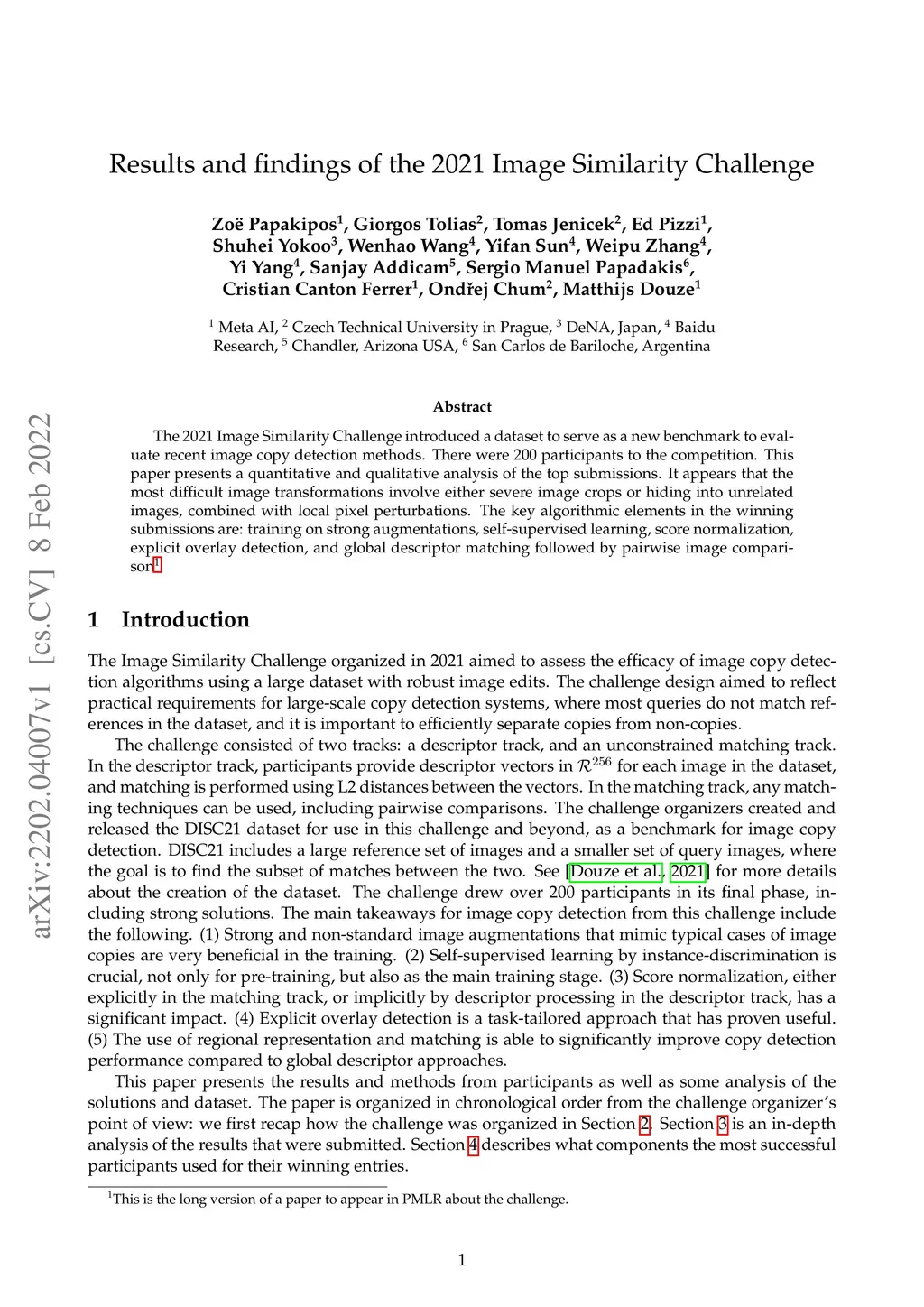 The 2021 Image Similarity Challenge introduced a dataset to serve as a new benchmark to evaluate recent image copy detection methods. There were 200 participants to the competition. This paper presents a quantitative and qualitative analysis of the top submissions. It appears that the most difficult image transformations involve either severe image crops or hiding into unrelated images, combined with local pixel perturbations. The key algorithmic elements in the winning submissions are: training on strong augmentations, self-supervised learning, score normalization, explicit overlay detection, and global descriptor matching followed by pairwise image comparison.