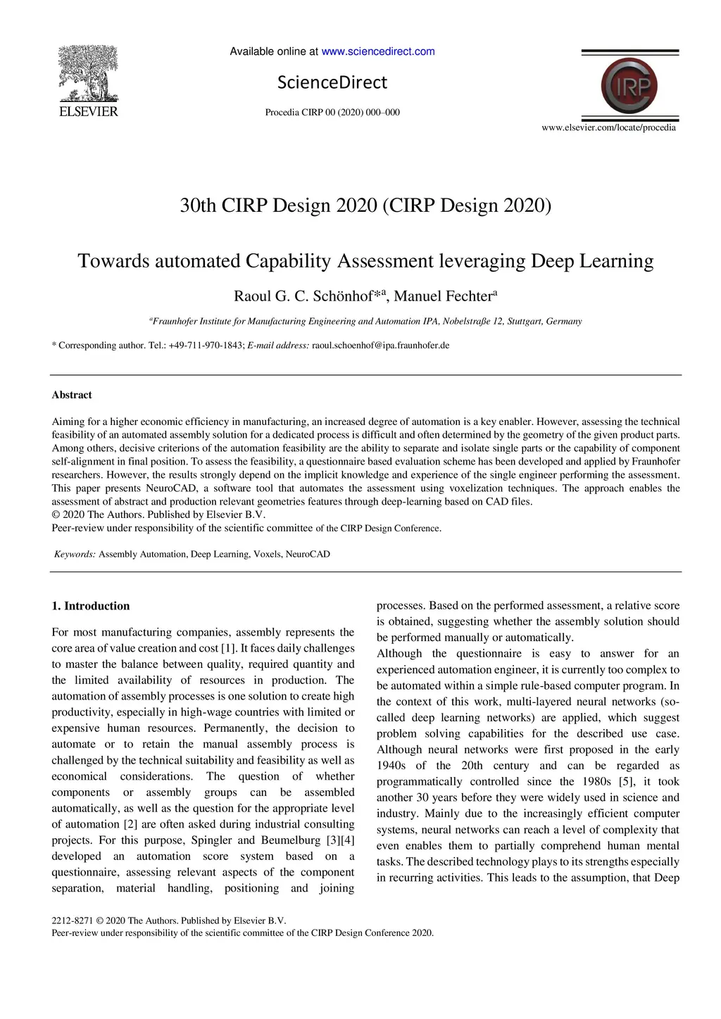Aiming for a higher economic efficiency in manufacturing, an increased degree of automation is a key enabler. However, assessing the technical feasibility of an automated assembly solution for a dedicated process is difficult and often determined by the geometry of the given product parts. Among others, decisive criterions of the automation feasibility are the ability to separate and isolate single parts or the capability of component self-alignment in final position. To assess the feasibility, a questionnaire based evaluation scheme has been developed and applied by Fraunhofer researchers. However, the results strongly depend on the implicit knowledge and experience of the single engineer performing the assessment. This paper presents NeuroCAD, a software tool that automates the assessment using voxelization techniques. The approach enables the assessment of abstract and production relevant geometries features through deep-learning based on CAD files.