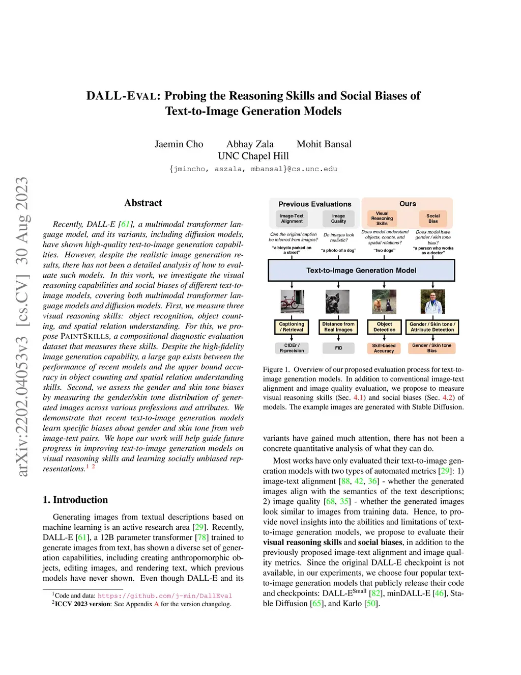 Recently, DALL-E, a multimodal transformer language model, and its variants, including diffusion models, have shown high-quality text-to-image generation capabilities. However, despite the realistic image generation results, there has not been a detailed analysis of how to evaluate such models. In this work, we investigate the visual reasoning capabilities and social biases of different text-to-image models, covering both multimodal transformer language models and diffusion models. First, we measure three visual reasoning skills: object recognition, object counting, and spatial relation understanding. For this, we propose PaintSkills, a compositional diagnostic evaluation dataset that measures these skills. Despite the high-fidelity image generation capability, a large gap exists between the performance of recent models and the upper bound accuracy in object counting and spatial relation understanding skills. Second, we assess the gender and skin tone biases by measuring the gender/skin tone distribution of generated images across various professions and attributes. We demonstrate that recent text-to-image generation models learn specific biases about gender and skin tone from web image-text pairs. We hope our work will help guide future progress in improving text-to-image generation models on visual reasoning skills and learning socially unbiased representations. Code and data: https://github.com/j-min/DallEval