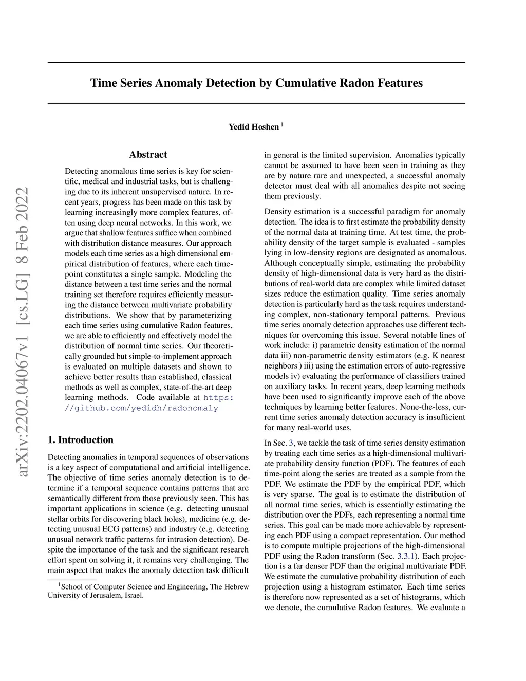 Time Series Anomaly Detection by Cumulative Radon Features