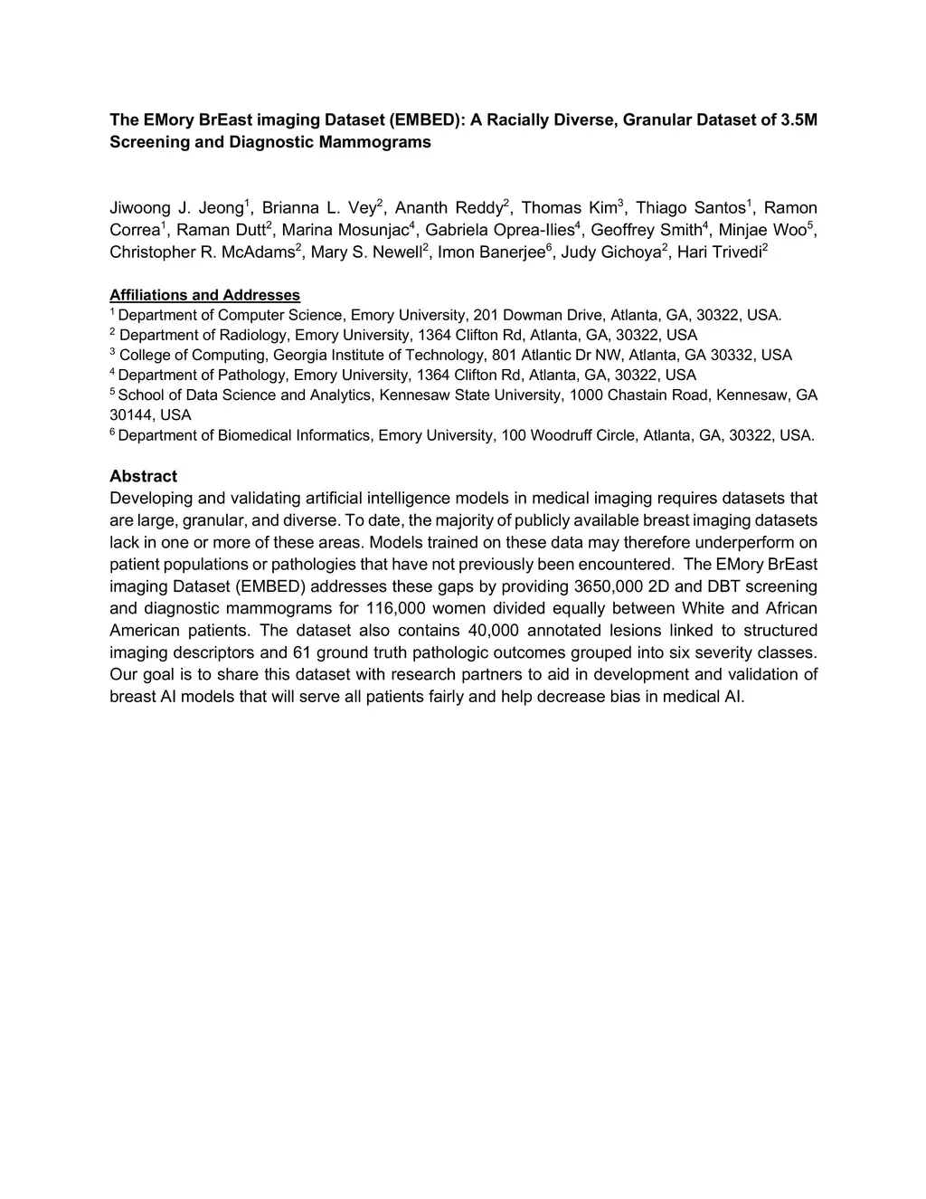 Developing and validating artificial intelligence models in medical imaging requires datasets that are large, granular, and diverse. To date, the majority of publicly available breast imaging datasets lack in one or more of these areas. Models trained on these data may therefore underperform on patient populations or pathologies that have not previously been encountered. The EMory BrEast imaging Dataset (EMBED) addresses these gaps by providing 3650,000 2D and DBT screening and diagnostic mammograms for 116,000 women divided equally between White and African American patients. The dataset also contains 40,000 annotated lesions linked to structured imaging descriptors and 61 ground truth pathologic outcomes grouped into six severity classes. Our goal is to share this dataset with research partners to aid in development and validation of breast AI models that will serve all patients fairly and help decrease bias in medical AI.