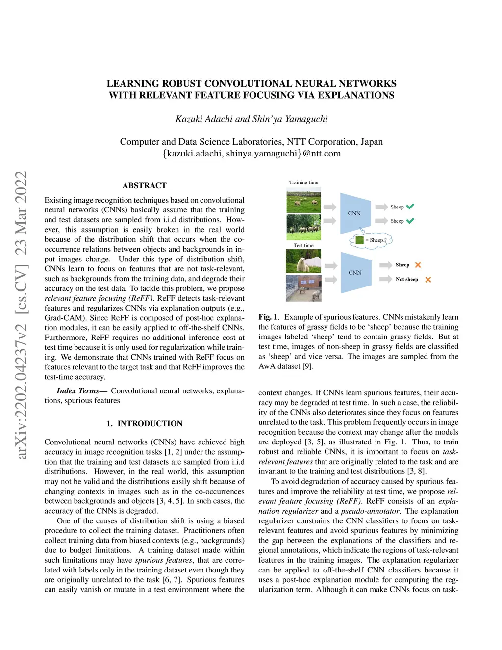 Existing image recognition techniques based on convolutional neural networks (CNNs) basically assume that the training and test datasets are sampled from i.i.d distributions. However, this assumption is easily broken in the real world because of the distribution shift that occurs when the co-occurrence relations between objects and backgrounds in input images change. Under this type of distribution shift, CNNs learn to focus on features that are not task-relevant, such as backgrounds from the training data, and degrade their accuracy on the test data. To tackle this problem, we propose relevant feature focusing (ReFF). ReFF detects task-relevant features and regularizes CNNs via explanation outputs (e.g., Grad-CAM). Since ReFF is composed of post-hoc explanation modules, it can be easily applied to off-the-shelf CNNs. Furthermore, ReFF requires no additional inference cost at test time because it is only used for regularization while training. We demonstrate that CNNs trained with ReFF focus on features relevant to the target task and that ReFF improves the test-time accuracy.