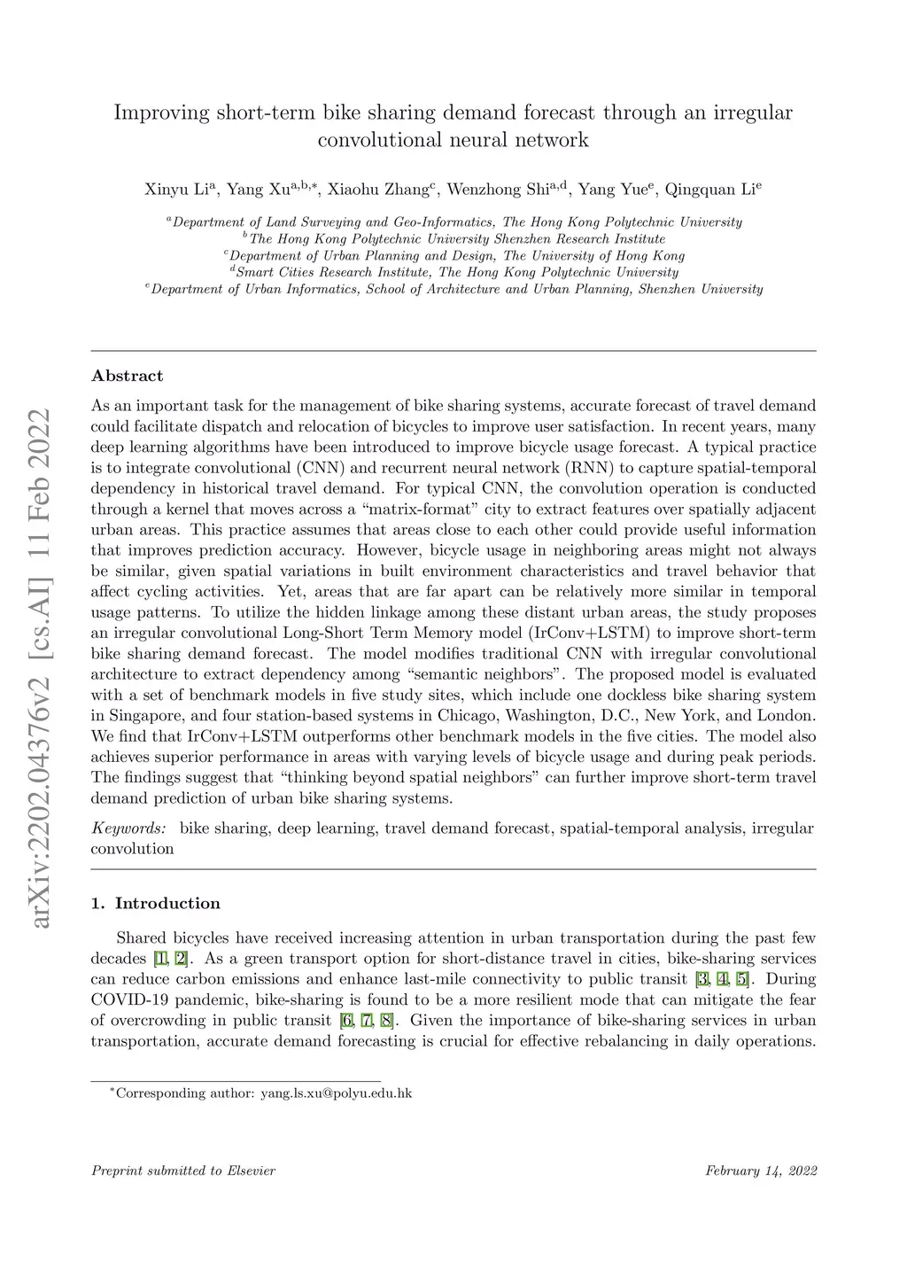 As an important task for the management of bike sharing systems, accurate forecast of travel demand could facilitate dispatch and relocation of bicycles to improve user satisfaction. In recent years, many deep learning algorithms have been introduced to improve bicycle usage forecast. A typical practice is to integrate convolutional (CNN) and recurrent neural network (RNN) to capture spatial-temporal dependency in historical travel demand. For typical CNN, the convolution operation is conducted through a kernel that moves across a "matrix-format" city to extract features over spatially adjacent urban areas. This practice assumes that areas close to each other could provide useful information that improves prediction accuracy. However, bicycle usage in neighboring areas might not always be similar, given spatial variations in built environment characteristics and travel behavior that affect cycling activities. Yet, areas that are far apart can be relatively more similar in temporal usage patterns. To utilize the hidden linkage among these distant urban areas, the study proposes an irregular convolutional Long-Short Term Memory model (IrConv+LSTM) to improve short-term bike sharing demand forecast. The model modifies traditional CNN with irregular convolutional architecture to extract dependency among "semantic neighbors". The proposed model is evaluated with a set of benchmark models in five study sites, which include one dockless bike sharing system in Singapore, and four station-based systems in Chicago, Washington, D.C., New York, and London. We find that IrConv+LSTM outperforms other benchmark models in the five cities. The model also achieves superior performance in areas with varying levels of bicycle usage and during peak periods. The findings suggest that "thinking beyond spatial neighbors" can further improve short-term travel demand prediction of urban bike sharing systems.