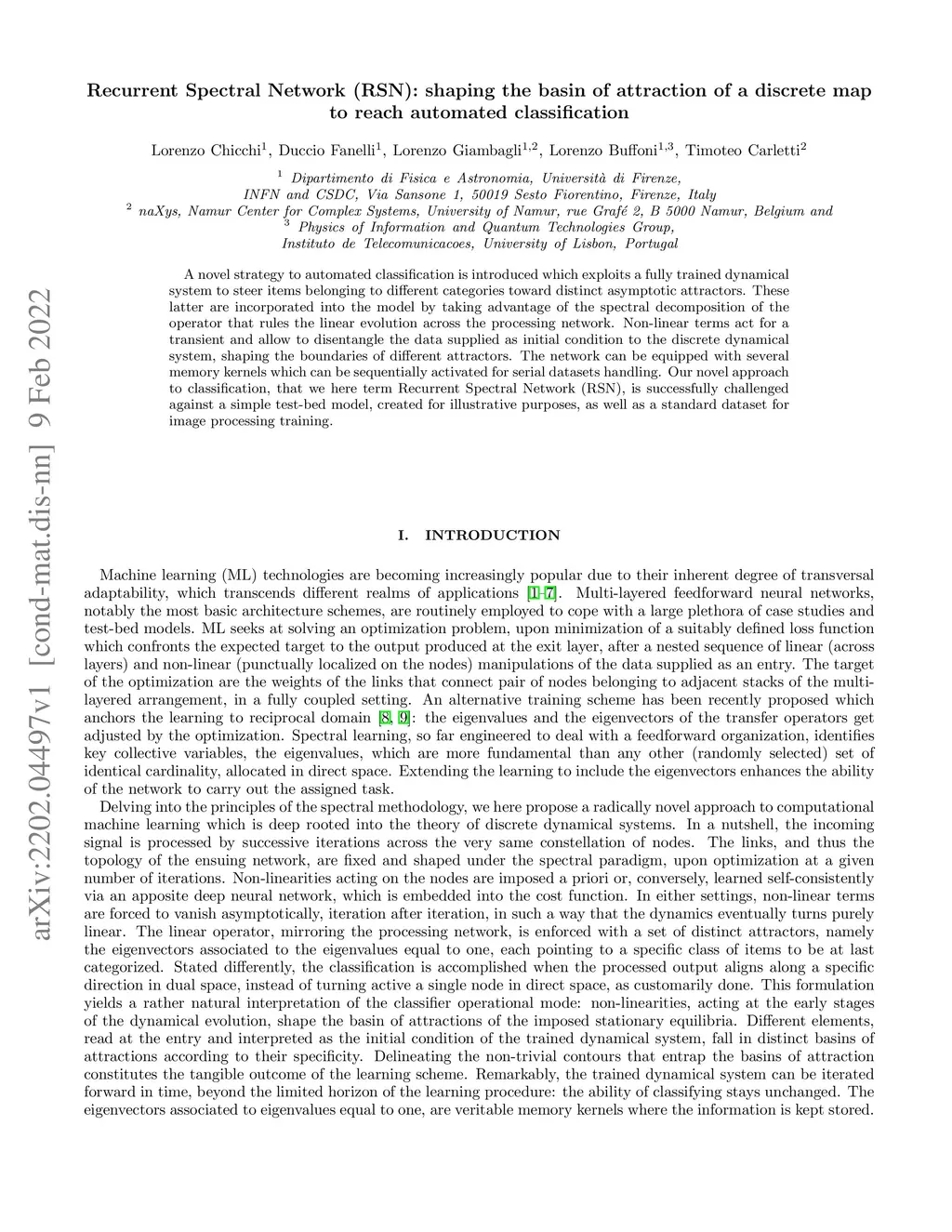 A novel strategy to automated classification is introduced which exploits a fully trained dynamical system to steer items belonging to different categories toward distinct asymptotic attractors. These latter are incorporated into the model by taking advantage of the spectral decomposition of the operator that rules the linear evolution across the processing network. Non-linear terms act for a transient and allow to disentangle the data supplied as initial condition to the discrete dynamical system, shaping the boundaries of different attractors. The network can be equipped with several memory kernels which can be sequentially activated for serial datasets handling. Our novel approach to classification, that we here term Recurrent Spectral Network (RSN), is successfully challenged against a simple test-bed model, created for illustrative purposes, as well as a standard dataset for image processing training.