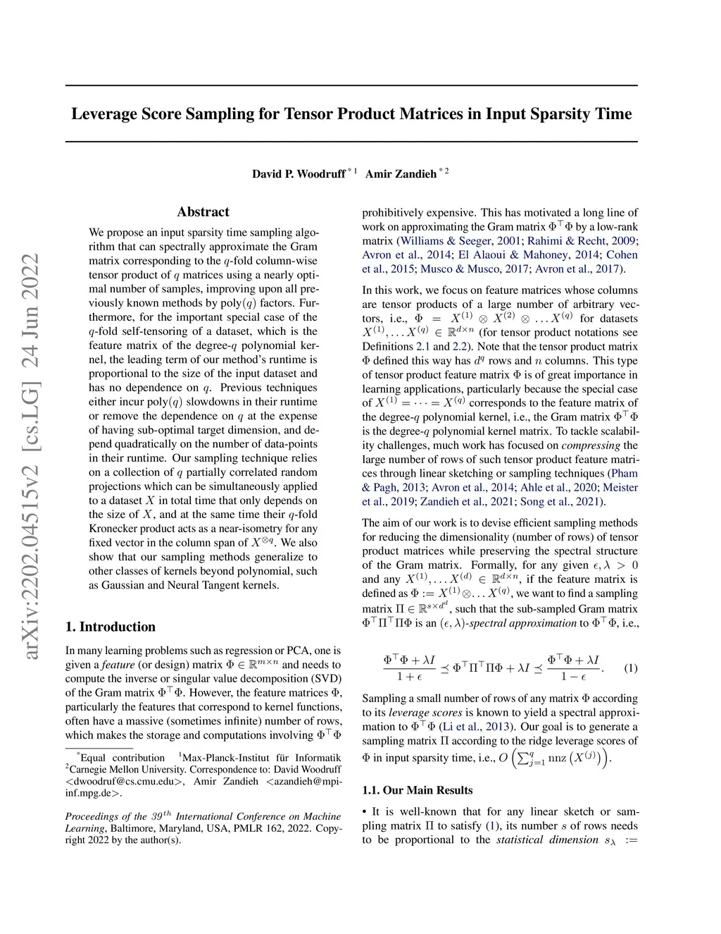 We propose an input sparsity time sampling algorithm that can spectrally approximate the Gram matrix corresponding to the -fold column-wise tensor product of matrices using a nearly optimal number of samples, improving upon all previously known methods by poly factors. Furthermore, for the important special case of the -fold self-tensoring of a dataset, which is the feature matrix of the degree- polynomial kernel, the leading term of our method's runtime is proportional to the size of the input dataset and has no dependence on . Previous techniques either incur poly slowdowns in their runtime or remove the dependence on at the expense of having sub-optimal target dimension, and depend quadratically on the number of data-points in their runtime. Our sampling technique relies on a collection of partially correlated random projections which can be simultaneously applied to a dataset in total time that only depends on the size of , and at the same time their -fold Kronecker product acts as a near-isometry for any fixed vector in the column span of . We also show that our sampling methods generalize to other classes of kernels beyond polynomial, such as Gaussian and Neural Tangent kernels.