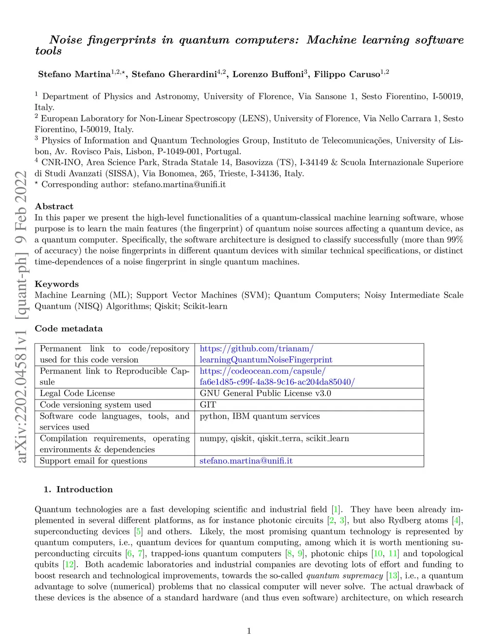 In this paper we present the high-level functionalities of a quantum-classical machine learning software, whose purpose is to learn the main features (the fingerprint) of quantum noise sources affecting a quantum device, as a quantum computer. Specifically, the software architecture is designed to classify successfully (more than 99% of accuracy) the noise fingerprints in different quantum devices with similar technical specifications, or distinct time-dependences of a noise fingerprint in single quantum machines.