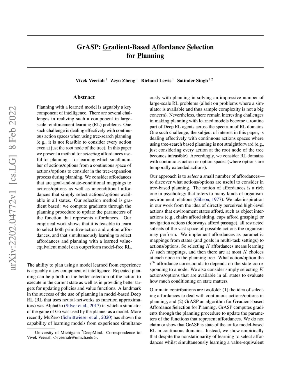Planning with a learned model is arguably a key component of intelligence. There are several challenges in realizing such a component in large-scale reinforcement learning (RL) problems. One such challenge is dealing effectively with continuous action spaces when using tree-search planning (e.g., it is not feasible to consider every action even at just the root node of the tree). In this paper we present a method for selecting affordances useful for planning -- for learning which small number of actions/options from a continuous space of actions/options to consider in the tree-expansion process during planning. We consider affordances that are goal-and-state-conditional mappings to actions/options as well as unconditional affordances that simply select actions/options available in all states. Our selection method is gradient based: we compute gradients through the planning procedure to update the parameters of the function that represents affordances. Our empirical work shows that it is feasible to learn to select both primitive-action and option affordances, and that simultaneously learning to select affordances and planning with a learned value-equivalent model can outperform model-free RL.