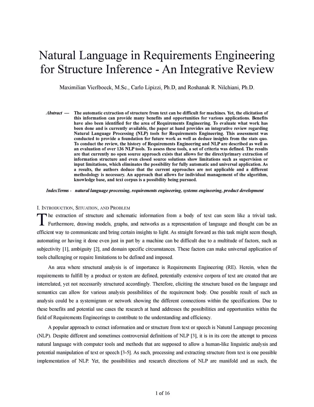 The automatic extraction of structure from text can be difficult for machines. Yet, the elicitation of this information can provide many benefits and opportunities for various applications. Benefits have also been identified for the area of Requirements Engineering. To evaluate what work has been done and is currently available, the paper at hand provides an integrative review regarding Natural Language Processing (NLP) tools for Requirements Engineering. This assessment was conducted to provide a foundation for future work as well as deduce insights from the stats quo. To conduct the review, the history of Requirements Engineering and NLP are described as well as an evaluation of over 136 NLP tools. To assess these tools, a set of criteria was defined. The results are that currently no open source approach exists that allows for the direct/primary extraction of information structure and even closed source solutions show limitations such as supervision or input limitations, which eliminates the possibility for fully automatic and universal application. As a results, the authors deduce that the current approaches are not applicable and a different methodology is necessary. An approach that allows for individual management of the algorithm, knowledge base, and text corpus is a possibility being pursued.