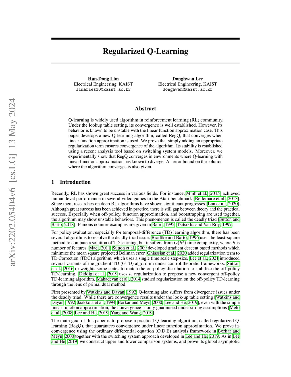 Q-learning is widely used algorithm in reinforcement learning community. Under the lookup table setting, its convergence is well established. However, its behavior is known to be unstable with the linear function approximation case. This paper develops a new Q-learning algorithm that converges when linear function approximation is used. We prove that simply adding an appropriate regularization term ensures convergence of the algorithm. We prove its stability using a recent analysis tool based on switching system models. Moreover, we experimentally show that it converges in environments where Q-learning with linear function approximation has known to diverge. We also provide an error bound on the solution where the algorithm converges.