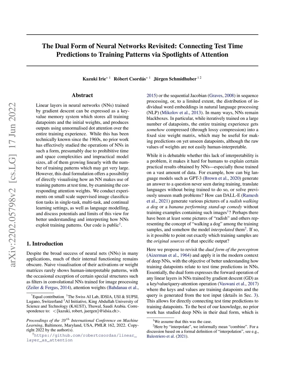 Linear layers in neural networks (NNs) trained by gradient descent can be expressed as a key-value memory system which stores all training datapoints and the initial weights, and produces outputs using unnormalised dot attention over the entire training experience. While this has been technically known since the 1960s, no prior work has effectively studied the operations of NNs in such a form, presumably due to prohibitive time and space complexities and impractical model sizes, all of them growing linearly with the number of training patterns which may get very large. However, this dual formulation offers a possibility of directly visualising how an NN makes use of training patterns at test time, by examining the corresponding attention weights. We conduct experiments on small scale supervised image classification tasks in single-task, multi-task, and continual learning settings, as well as language modelling, and discuss potentials and limits of this view for better understanding and interpreting how NNs exploit training patterns. Our code is public.