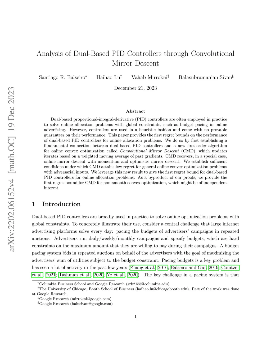 Dual-based proportional-integral-derivative (PID) controllers are often employed in practice to solve online allocation problems with global constraints, such as budget pacing in online advertising. However, controllers are used in a heuristic fashion and come with no provable guarantees on their performance. This paper provides the first regret bounds on the performance of dual-based PID controllers for online allocation problems. We do so by first establishing a fundamental connection between dual-based PID controllers and a new first-order algorithm for online convex optimization called \emph{Convolutional Mirror Descent} (CMD), which updates iterates based on a weighted moving average of past gradients. CMD recovers, in a special case, online mirror descent with momentum and optimistic mirror descent. We establish sufficient conditions under which CMD attains low regret for general online convex optimization problems with adversarial inputs. We leverage this new result to give the first regret bound for dual-based PID controllers for online allocation problems. As a byproduct of our proofs, we provide the first regret bound for CMD for non-smooth convex optimization, which might be of independent interest.