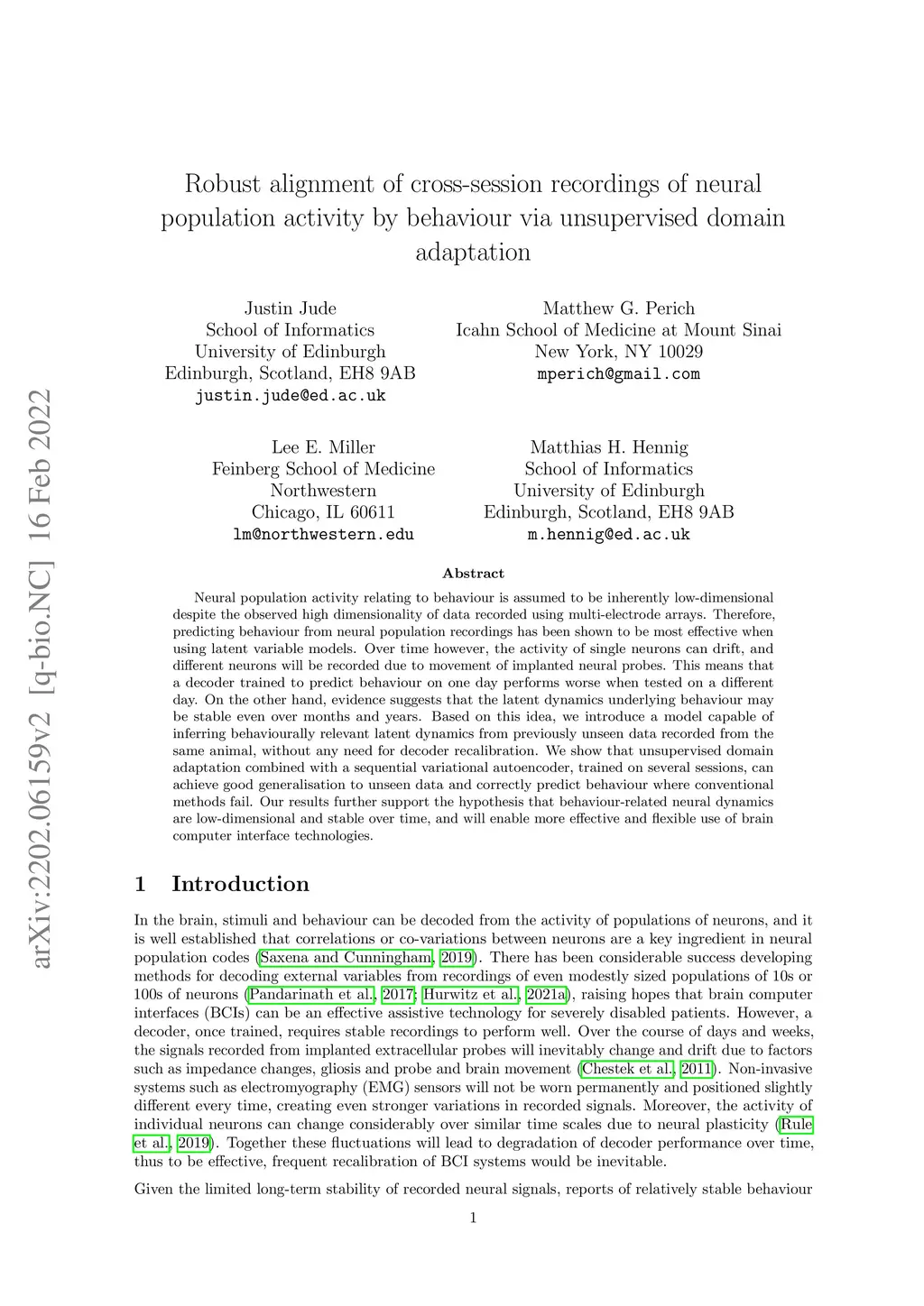Neural population activity relating to behaviour is assumed to be inherently low-dimensional despite the observed high dimensionality of data recorded using multi-electrode arrays. Therefore, predicting behaviour from neural population recordings has been shown to be most effective when using latent variable models. Over time however, the activity of single neurons can drift, and different neurons will be recorded due to movement of implanted neural probes. This means that a decoder trained to predict behaviour on one day performs worse when tested on a different day. On the other hand, evidence suggests that the latent dynamics underlying behaviour may be stable even over months and years. Based on this idea, we introduce a model capable of inferring behaviourally relevant latent dynamics from previously unseen data recorded from the same animal, without any need for decoder recalibration. We show that unsupervised domain adaptation combined with a sequential variational autoencoder, trained on several sessions, can achieve good generalisation to unseen data and correctly predict behaviour where conventional methods fail. Our results further support the hypothesis that behaviour-related neural dynamics are low-dimensional and stable over time, and will enable more effective and flexible use of brain computer interface technologies.