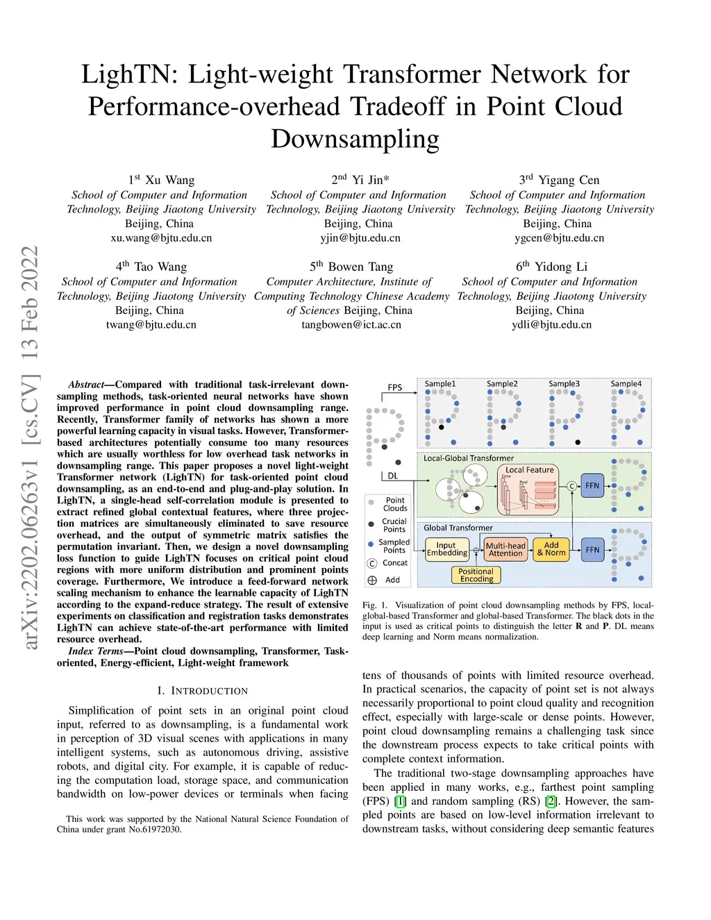 Compared with traditional task-irrelevant downsampling methods, task-oriented neural networks have shown improved performance in point cloud downsampling range. Recently, Transformer family of networks has shown a more powerful learning capacity in visual tasks. However, Transformer-based architectures potentially consume too many resources which are usually worthless for low overhead task networks in downsampling range. This paper proposes a novel light-weight Transformer network (LighTN) for task-oriented point cloud downsampling, as an end-to-end and plug-and-play solution. In LighTN, a single-head self-correlation module is presented to extract refined global contextual features, where three projection matrices are simultaneously eliminated to save resource overhead, and the output of symmetric matrix satisfies the permutation invariant. Then, we design a novel downsampling loss function to guide LighTN focuses on critical point cloud regions with more uniform distribution and prominent points coverage. Furthermore, We introduce a feed-forward network scaling mechanism to enhance the learnable capacity of LighTN according to the expand-reduce strategy. The result of extensive experiments on classification and registration tasks demonstrates LighTN can achieve state-of-the-art performance with limited resource overhead.