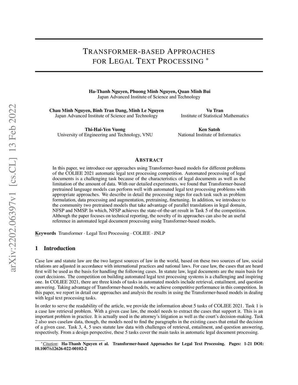In this paper, we introduce our approaches using Transformer-based models for different problems of the COLIEE 2021 automatic legal text processing competition. Automated processing of legal documents is a challenging task because of the characteristics of legal documents as well as the limitation of the amount of data. With our detailed experiments, we found that Transformer-based pretrained language models can perform well with automated legal text processing problems with appropriate approaches. We describe in detail the processing steps for each task such as problem formulation, data processing and augmentation, pretraining, finetuning. In addition, we introduce to the community two pretrained models that take advantage of parallel translations in legal domain, NFSP and NMSP. In which, NFSP achieves the state-of-the-art result in Task 5 of the competition. Although the paper focuses on technical reporting, the novelty of its approaches can also be an useful reference in automated legal document processing using Transformer-based models.