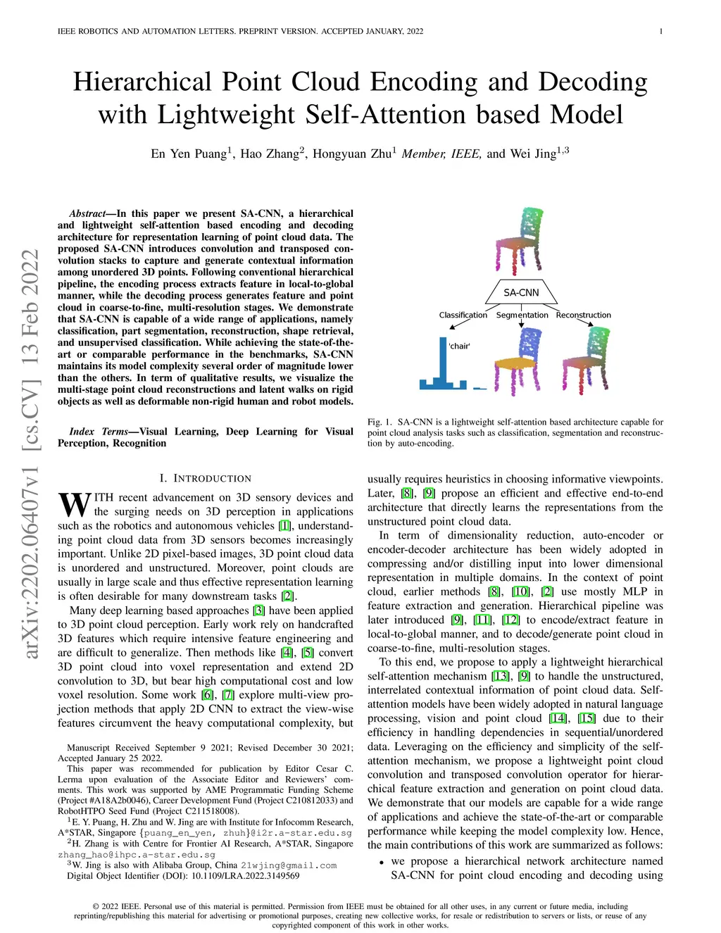 In this paper we present SA-CNN, a hierarchical and lightweight self-attention based encoding and decoding architecture for representation learning of point cloud data. The proposed SA-CNN introduces convolution and transposed convolution stacks to capture and generate contextual information among unordered 3D points. Following conventional hierarchical pipeline, the encoding process extracts feature in local-to-global manner, while the decoding process generates feature and point cloud in coarse-to-fine, multi-resolution stages. We demonstrate that SA-CNN is capable of a wide range of applications, namely classification, part segmentation, reconstruction, shape retrieval, and unsupervised classification. While achieving the state-of-the-art or comparable performance in the benchmarks, SA-CNN maintains its model complexity several order of magnitude lower than the others. In term of qualitative results, we visualize the multi-stage point cloud reconstructions and latent walks on rigid objects as well as deformable non-rigid human and robot models.