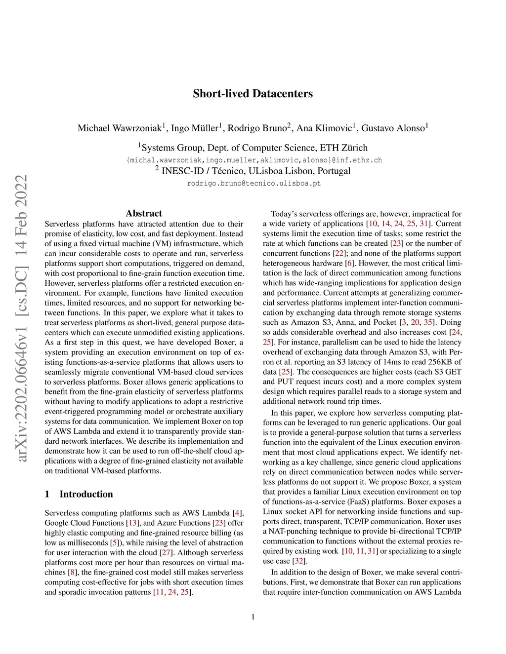 Serverless platforms have attracted attention due to their promise of elasticity, low cost, and fast deployment. Instead of using a fixed virtual machine (VM) infrastructure, which can incur considerable costs to operate and run, serverless platforms support short computations, triggered on demand, with cost proportional to fine-grain function execution time. However, serverless platforms offer a restricted execution environment. For example, functions have limited execution times, limited resources, and no support for networking between functions. In this paper, we explore what it takes to treat serverless platforms as short-lived, general purpose data-centers which can execute unmodified existing applications. As a first step in this quest, we have developed Boxer, a system providing an execution environment on top of existing functions-as-a-service platforms that allows users to seamlessly migrate conventional VM-based cloud services to serverless platforms. Boxer allows generic applications to benefit from the fine-grain elasticity of serverless platforms without having to modify applications to adopt a restrictive event-triggered programming model or orchestrate auxiliary systems for data communication. We implement Boxer on top of AWS Lambda and extend it to transparently provide standard network interfaces. We describe its implementation and demonstrate how it can be used to run off-the-shelf cloud applications with a degree of fine-grained elasticity not available on traditional VM-based platforms.